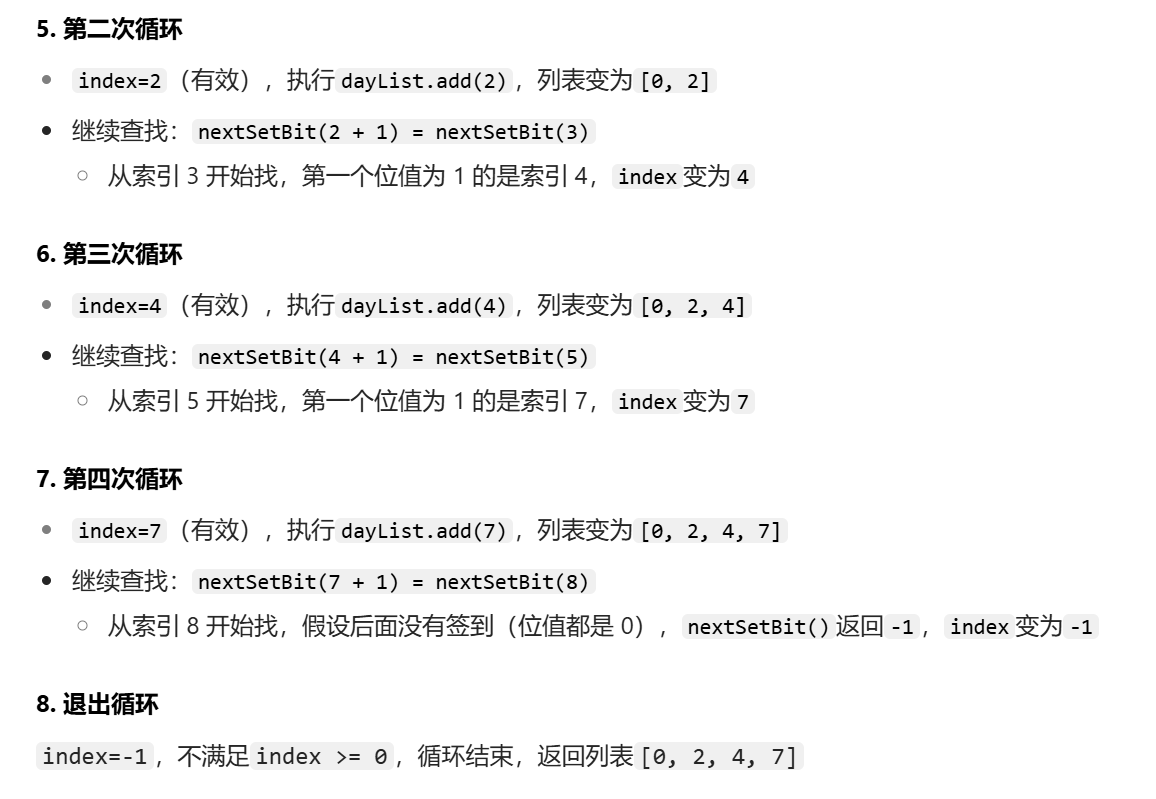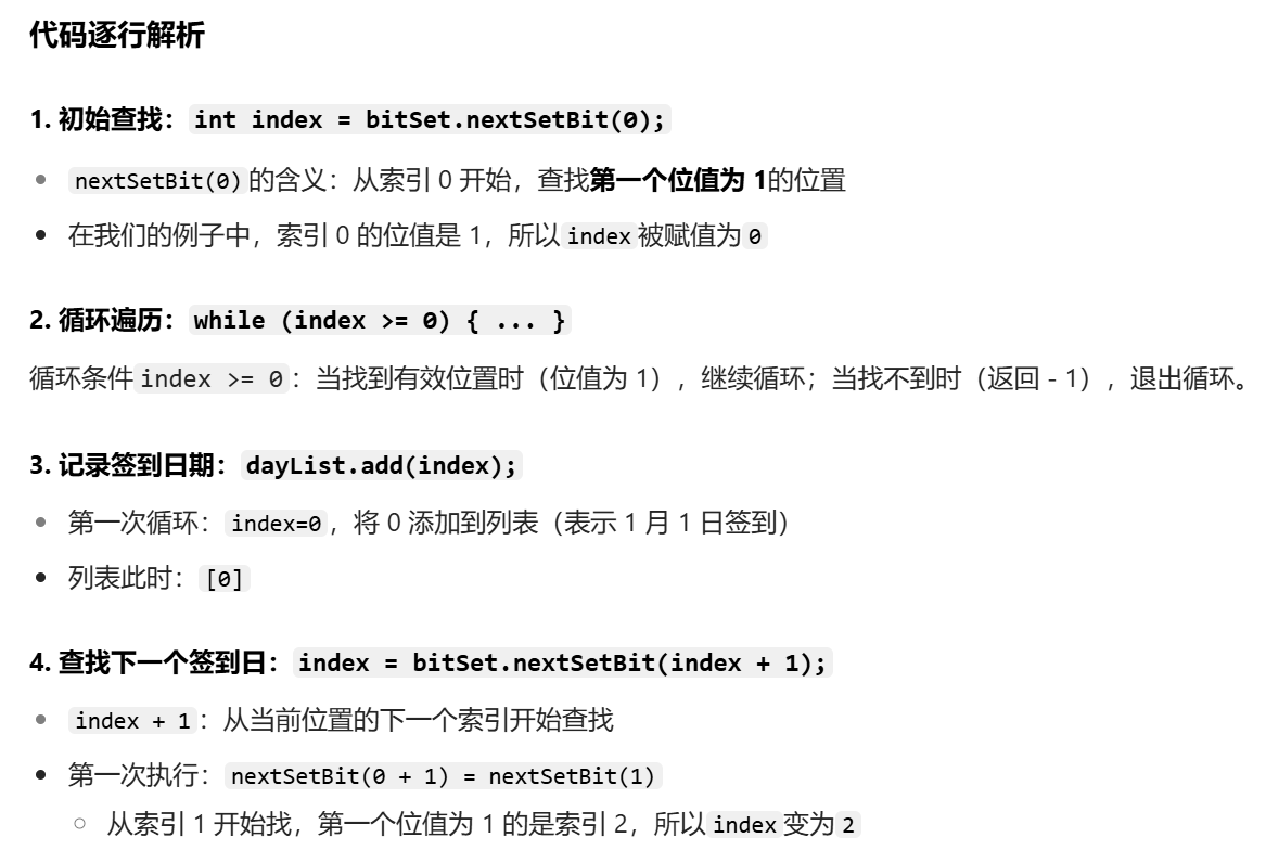 for (int dayOfYear = 1; dayOfYear <= totalDays; dayOfYear++) {// 获取 key:当前日期LocalDate currentDate = LocalDate.ofYearDay(year, dayOfYear);// 获取 value:当天是否有刷题boolean hasRecord = signInBitSet.get(dayOfYear);// 将结果放入 mapresult.put(currentDate, hasRecord);