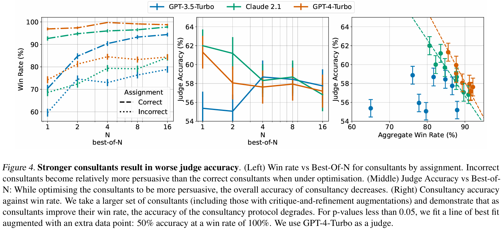 洞见4:Consultant能力越强,咨询准确率反而下降。用best-of-N与critique-and-refinement生成大量Consultant。图4-left显示,优化后Consultant胜率提高;由于RLHF模型本善于为正确立场辩护,优化可能disproportionately提升其为错误立场辩护的能力,导致裁判性能下降(图4-middle/right)。附录直接对比了辩论与咨询。