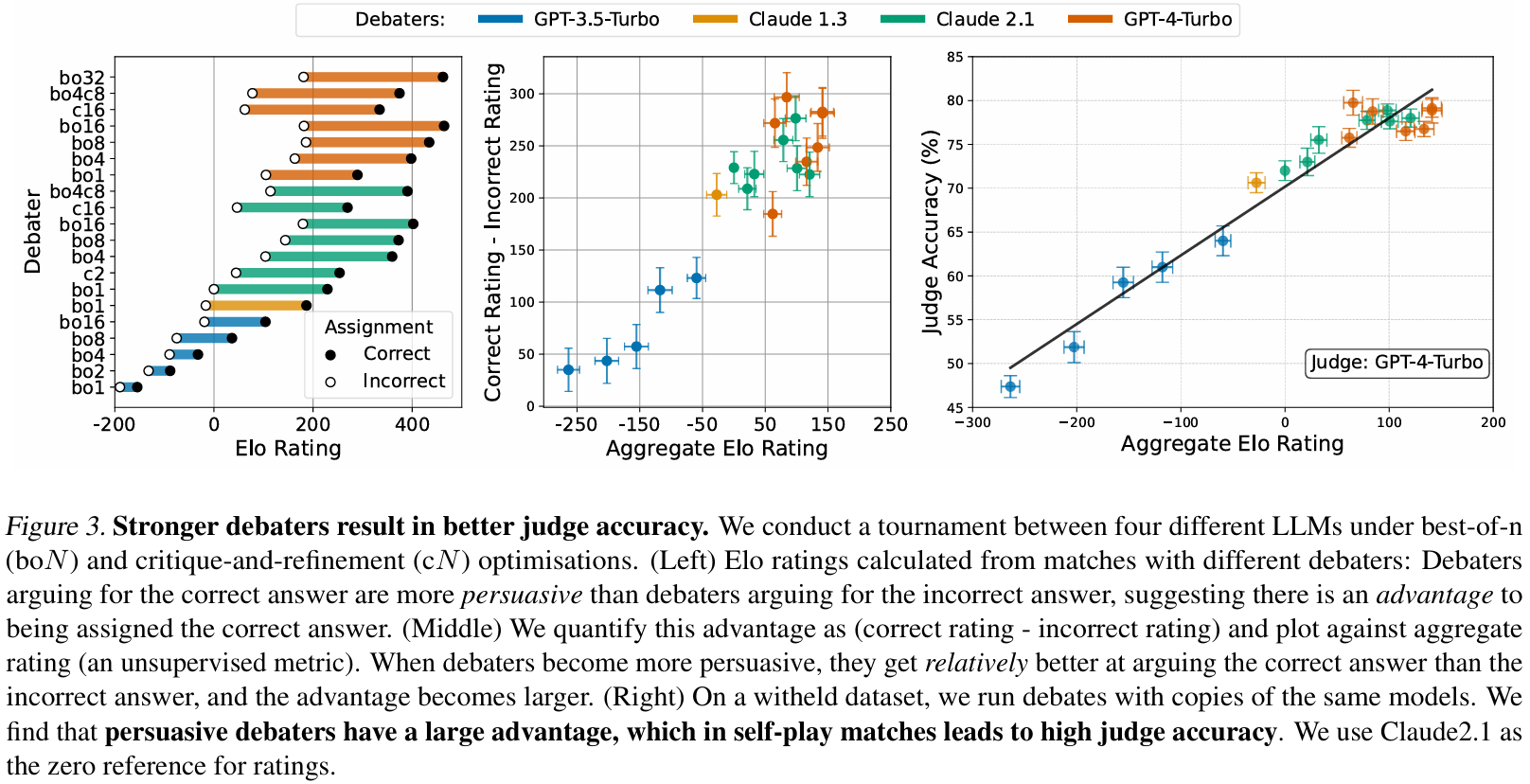 洞见3:辩手聚合Elo越高,裁判准确率越高。用锦标赛排名,让同一模型副本自对弈,GPT-4-Turbo裁判给出准确率。图3-right显示聚合Elo与裁判准确率强相关:以无监督胜率(裁判偏好)为优化目标,反而提升裁判判断真相的能力。这为“最优辩论可揭示真相”提供了弱证据(Irving et al., 2018),并暗示更强辩手可让非专家获得更高准确率。