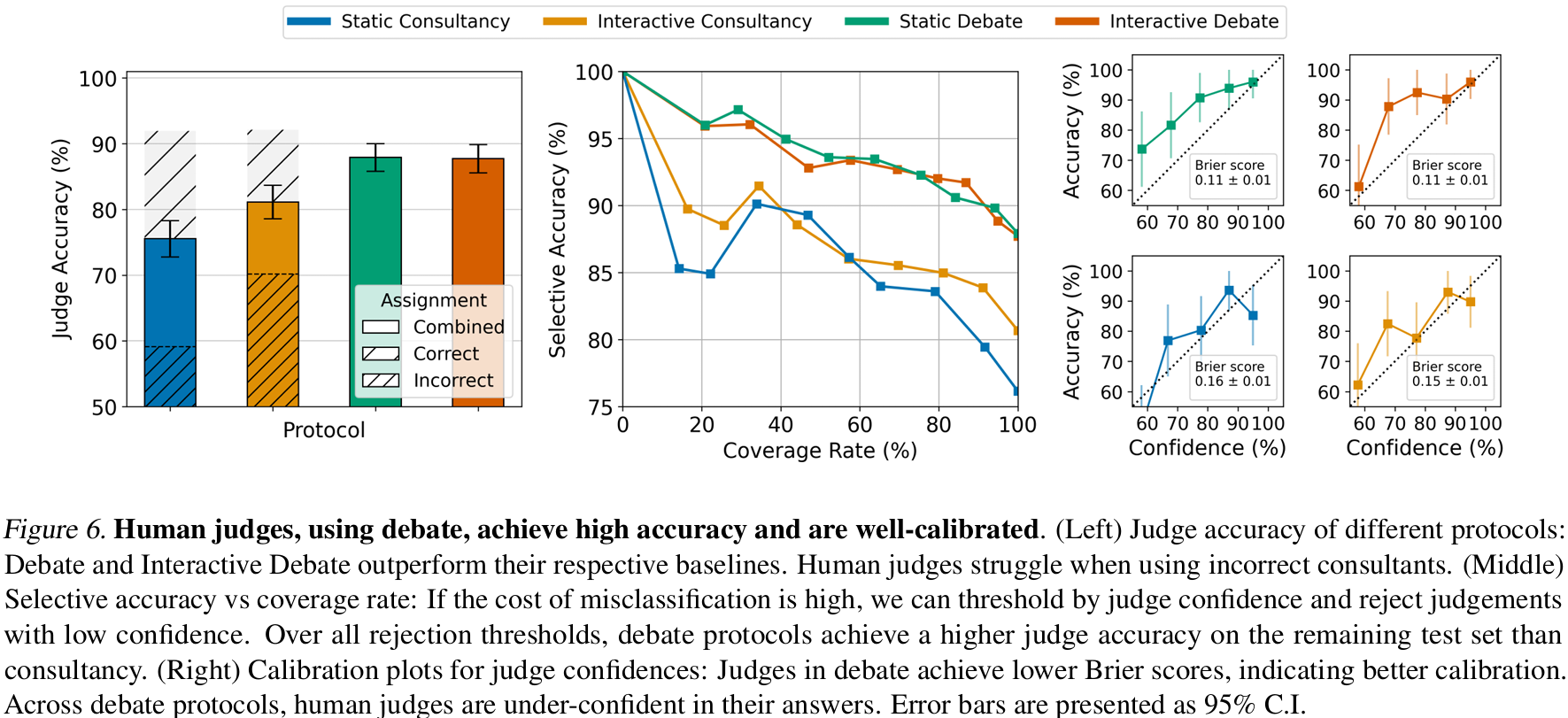 洞见8:高置信度的辩论判断非常可靠。人类裁判以5%-95%区间给出置信度。若拒绝低置信判断(如<75%),静态辩论在保留65%题目时准确率升至94%。在所有拒绝阈值下,辩论协议的剩余准确率均高于咨询(图6-middle)。辩论裁判的Brier分数也更低(图6-right),表明校准更好。