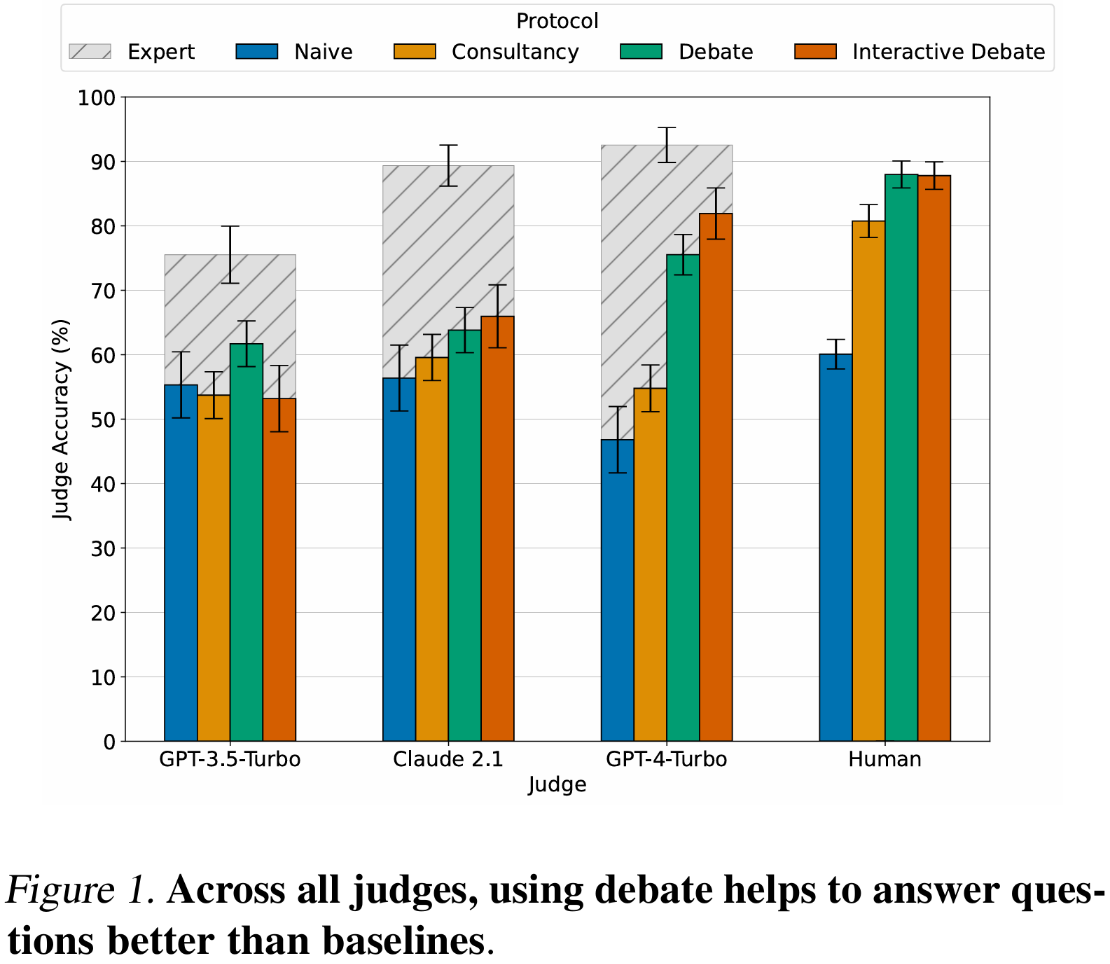 - 弱裁判确能监督强辩手。最具说服力的配置下,非专家人类裁判借助辩论可达88%准确率,非专家LLM裁判达76%,显著高于朴素基线(60%与48%)。