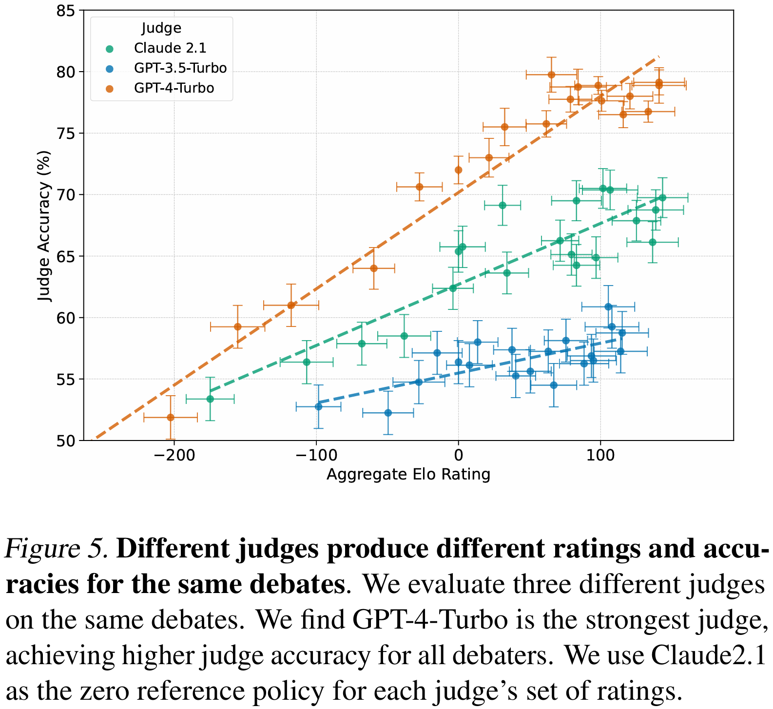 洞见5:更强裁判在所有辩手强度上都能更准确地识别正确论证。用Claude 2.1与GPT-3.5-Turbo重新裁判同一场交叉赛。图5显示,不同裁判给出的胜率、聚合Elo与自对弈准确率均不同;更强裁判产生的Elo分布更宽,且在全区间内准确率更高。即使偏好模型与裁判模型不同,强辩手仍能提升辩论准确率。附录给出提升裁判性能的其他方法。