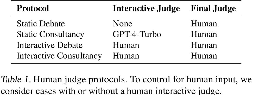 我们关心LLM裁判结果是否泛化到人类、人类是否优于LLM,以及协议在实施层面有何差异。为此,我们测试了每种协议的静态与互动两种变体(表1)。静态协议仅最后一步由人类裁判选择答案;互动协议允许人类在过程中提问或澄清。