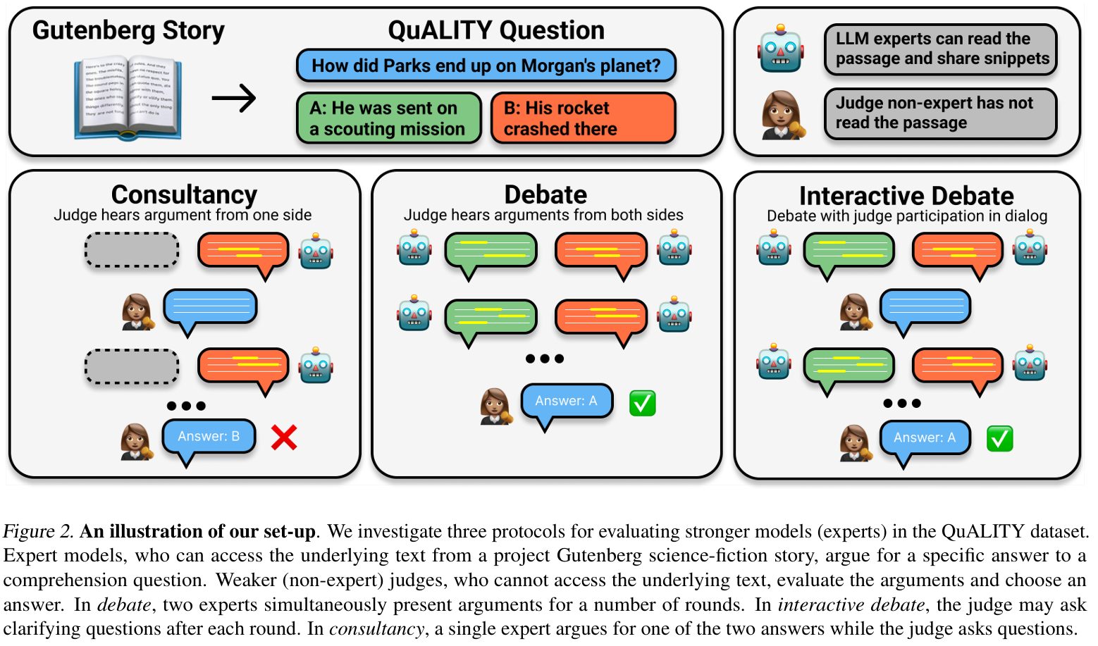 - 有专家/辩手能读完整篇Project Gutenberg科幻故事;裁判(Judge)完全看不到原文。