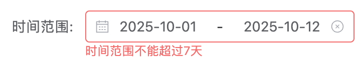 <script setup lang="ts">//...省略const queryForm = ref({date: [dayjs().subtract(1, 'day').toDate(), dayjs().toDate()],});const formRef = ref();// 添加验证函数const validateDateRange = (_rule: any, value: [Date, Date], callback: (error?: string) => void) => {if (!value || value.length !== 2) {callback('请选择完整的日期范围');return;}const [start, end] = value;const diffDays = Math.ceil((end.getTime() - start.getTime()) / (1000 * 60 * 60 * 24));console.log(diffDays);if (diffDays > 7) {callback('时间范围不能超过7天');} else {callback();}};const rules = {flightDate: [{validator: validateDateRange,trigger: 'change',},],};const onDateChange = () => {formRef.value?.validateField('flightDate');};