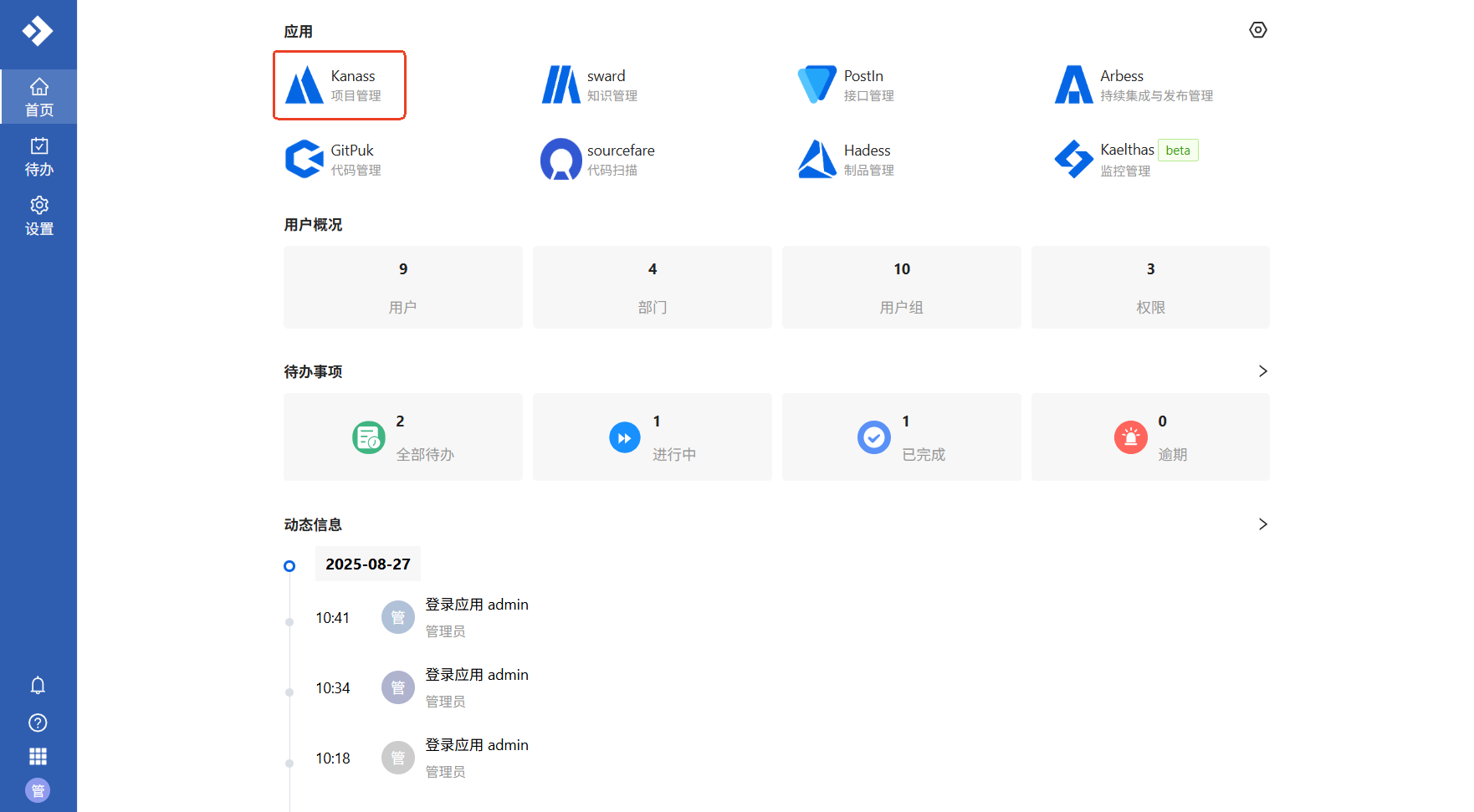 admin登录soular->首页->点击应用中的kanass,可以直接打开并登录kanass系统。统一登录配置成功。