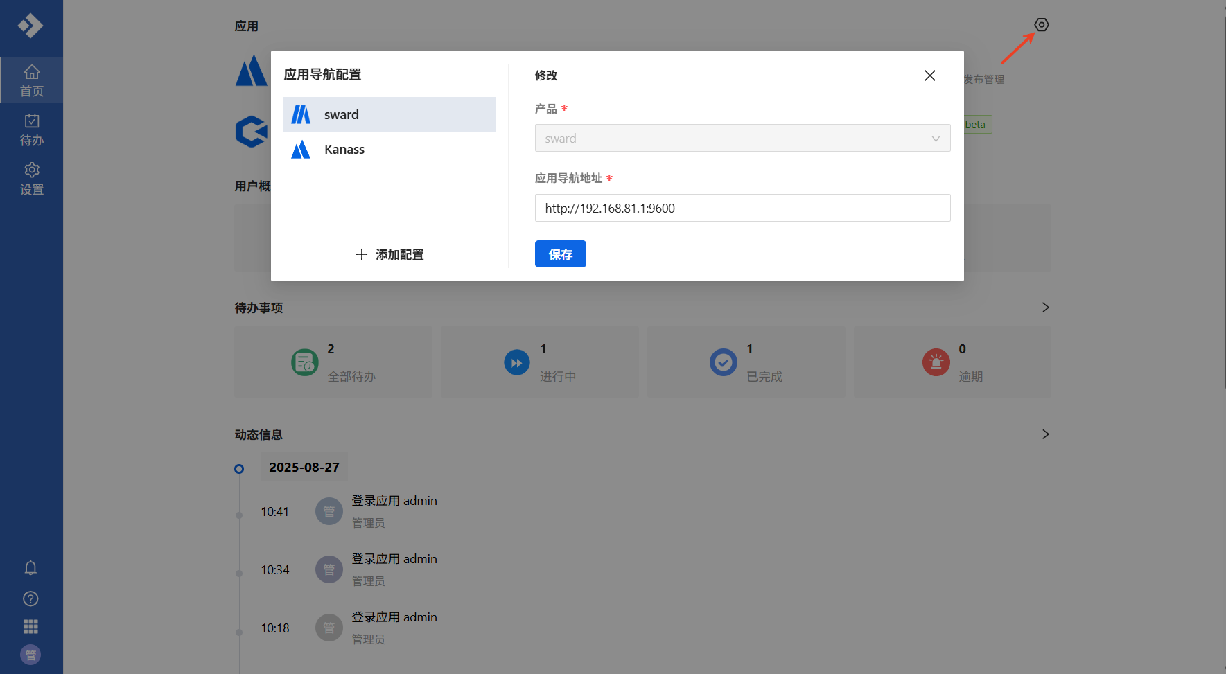 soular首页->应用配置->选择产品->sward(以sward为例)->应用导航地址为sward链接地址->保存