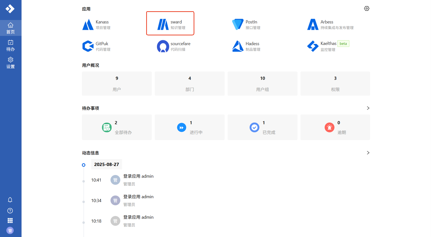 admin登录soular->首页->点击应用中的sward,可以直接打开并登录sward系统。统一登录配置成功。