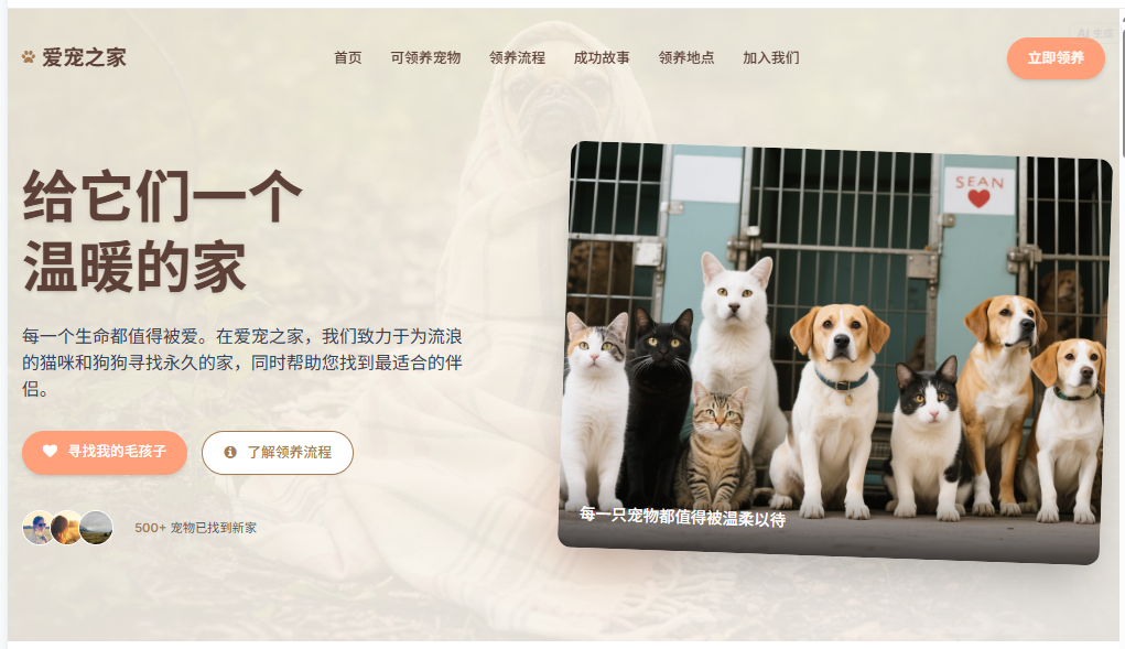 一个宠物领养公益平台的首页模板,目标是提升用户领养转化率并增强平台透明度与信任感。网站应包含多个关键模块:1)可领养宠物展示区,支持按品种、年龄、性格筛选,并配有真实照片与简短性格描述;2)清晰可视化的领养流程图,帮助新用户快速理解申请步骤;3)领养者反馈板块,展示真实用户故事与评价,增强说服力;4)志愿者招募与捐助入口,鼓励社区参与;5)地图定位模块,支持根据城市或定位查找附近可领养机构或收容点。整体视觉风格需温暖、亲切,建议使用米黄、浅橙、浅棕等柔和色系搭配柔光阴影,照片使用真实宠物形象,突出眼神交流和亲近感。页面布局应简洁清晰,适配移动端访问,具备基础的 CTA(如“立即领养”、“了解流程”)按钮引导用户行动。