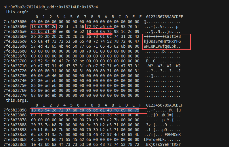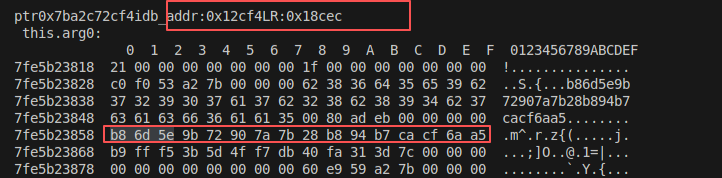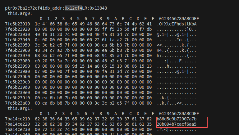 Interceptor.attach(addr,{onEnter:function(args){this.arg0=args[0];this.arg1=args[1];this.arg2=args[2];this.arg3=args[3];this.lr=this.context.lr;},onLeave:function(retval){console.log("ptr"+ptr(addr)+"idb_addr:"+ptr(idb_addr)+"LR:"+ptr(this.lr).sub(base_hell_jni)+"\r\n","this.arg0:\r\n",hex_dump(this.arg0),"this.arg1:\r\n",hex_dump(this.arg1),"this.arg2:\r\n",hex_dump(this.arg2),"this.arg3:\r\n",hex_dump(this.arg3),"retval:\r\n", hex_dump(retval));}