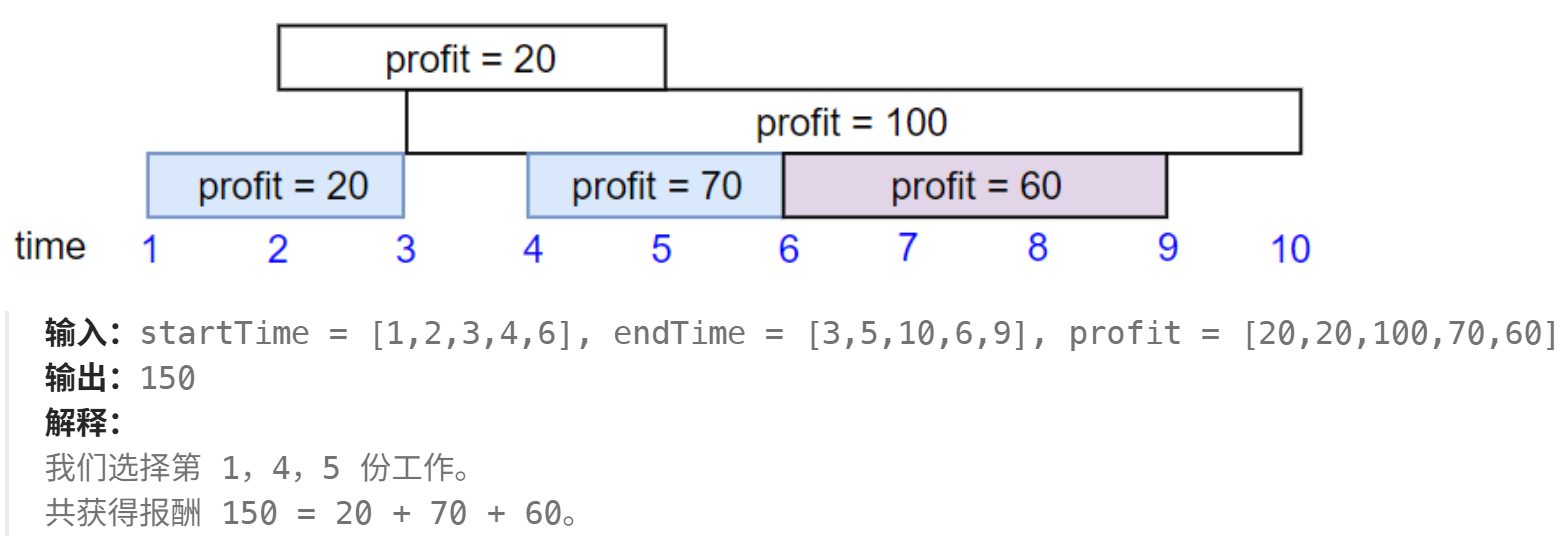 class Solution:def jobScheduling(self, startTime: List[int], endTime: List[int], profit: List[int]) -> int:n=len(endTime)a=sorted(zip(startTime,endTime,profit),key=lambda p:p[1])dp=[0]*(n+1)for i in range(n):k=bisect_right(a,a[i][0],hi=i,key=lambda p:p[1])dp[i+1]=max(dp[i],dp[k]+a[i][2])return dp[n]