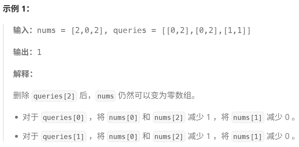 class Solution:def maxRemoval(self, nums: List[int], queries: List[List[int]]) -> int:queries.sort(key=lambda q: q[0]) # 按照左端点从小到大排序h = []diff = [0] * (len(nums) + 1)sum_d = j = 0for i, x in enumerate(nums):sum_d += diff[i]# 维护左端点 <= i 的区间while j < len(queries) and queries[j][0] <= i:heappush(h, -queries[j][1]) # 取相反数表示最大堆j += 1# 选择右端点最大的区间while sum_d < x and h and -h[0] >= i:sum_d += 1diff[-heappop(h) + 1] -= 1if sum_d < x:return -1return len(h)