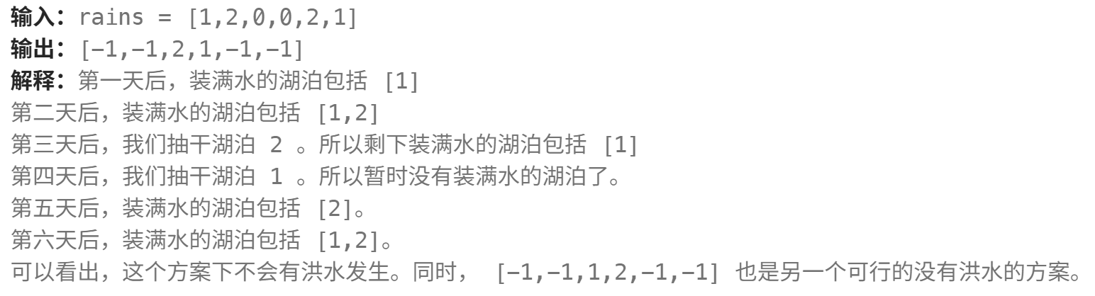 class Solution:def avoidFlood(self, rains: List[int]) -> List[int]:n = len(rains)ans = [-1] * nfull_day = {} # lake -> 装满日dry_day = SortedList() # 未被使用的抽水日for i, lake in enumerate(rains):if lake == 0:ans[i] = 1 # 先随便选一个湖抽干dry_day.add(i) # 保存抽水日continueif lake in full_day:j = full_day[lake]# 必须在 j 之后,i 之前把 lake 抽干# 选一个最早的未被使用的抽水日,如果选晚的,可能会导致其他湖没有可用的抽水日k = dry_day.bisect_right(j)if k == len(dry_day):return [] # 无法阻止洪水d = dry_day[k]ans[d] = lakedry_day.discard(d) # 移除已使用的抽水日full_day[lake] = i # 插入或更新装满日return ans
