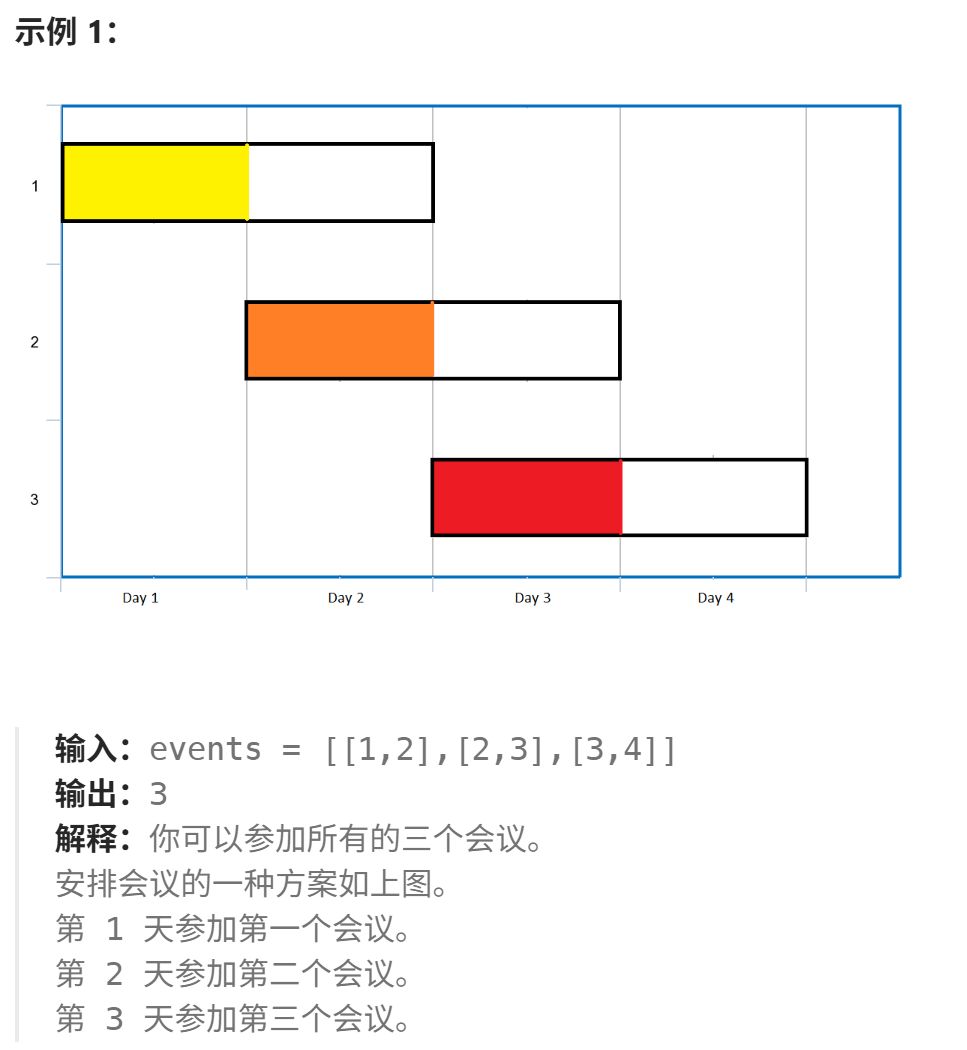 我们从前到后 遍历每一天 看每天该排哪个会议。 能参加需要开始时间早于这天。