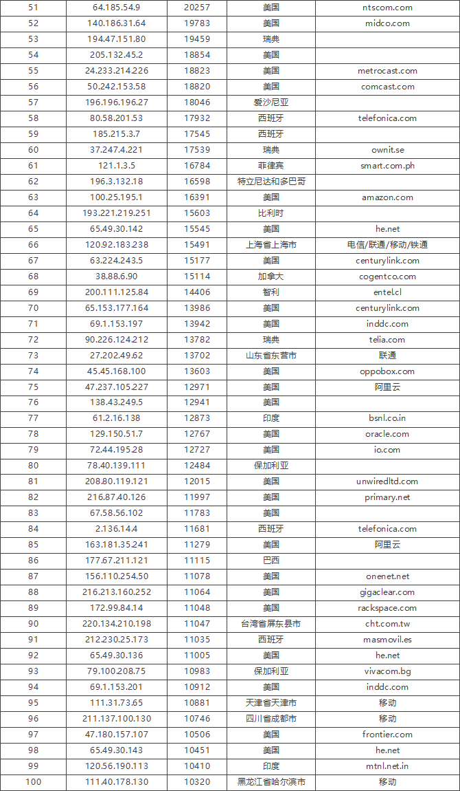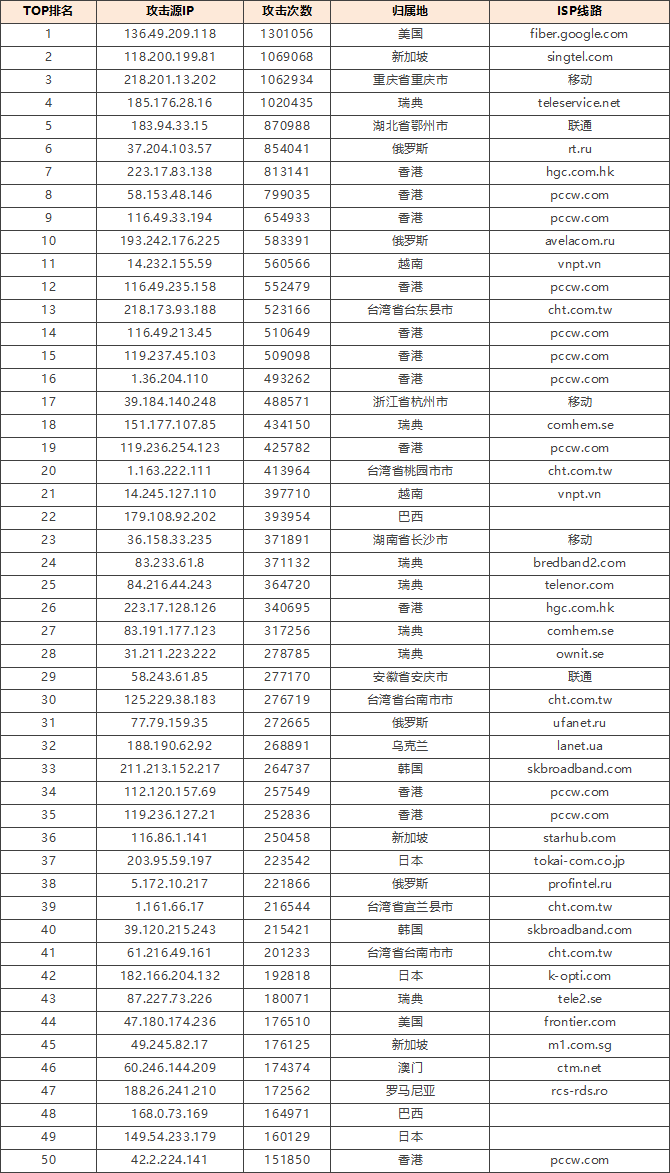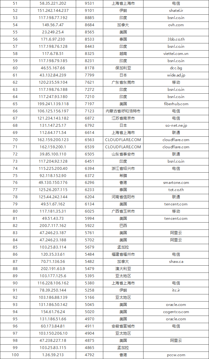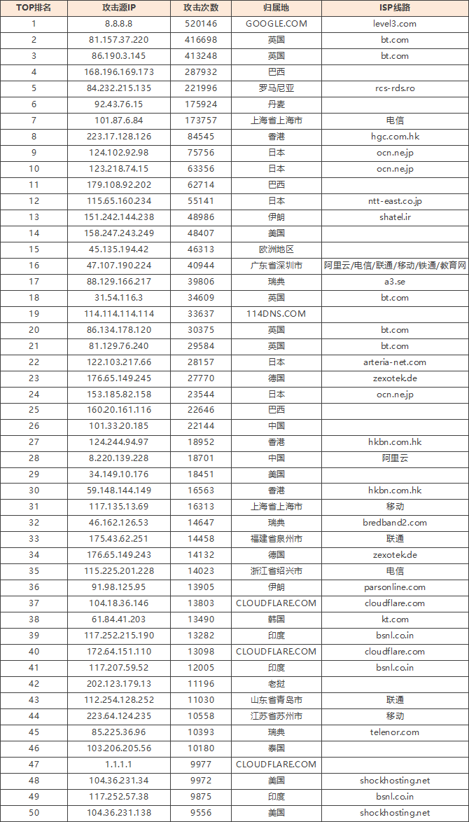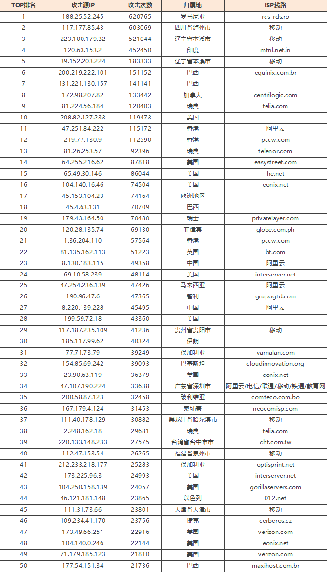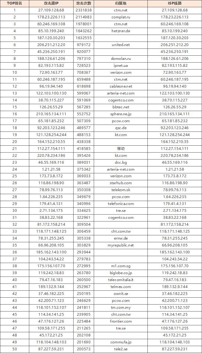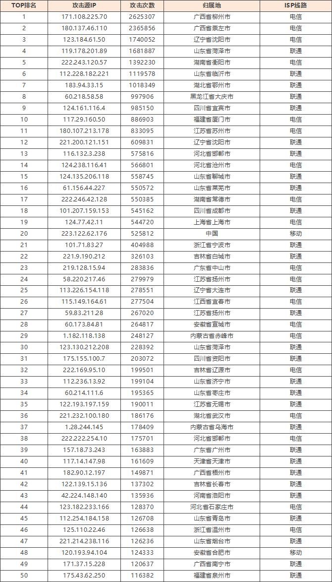 免责声明:因 IP 地理位置数据库存在更新延迟,报告中显示的属地和运营商信息仅供参考。鉴于 DDoS 攻击流量中可能存在虚假源 IP,如您将下列攻击源信息应用于网络安全设备策略,由此产生的误判或误拦后果,傲盾软件概不承担相关责任。