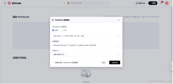 Notebook计算类型:”NPU”,”NPU basic · 1 * NPU 910B · 4v CPU · 8GB”。