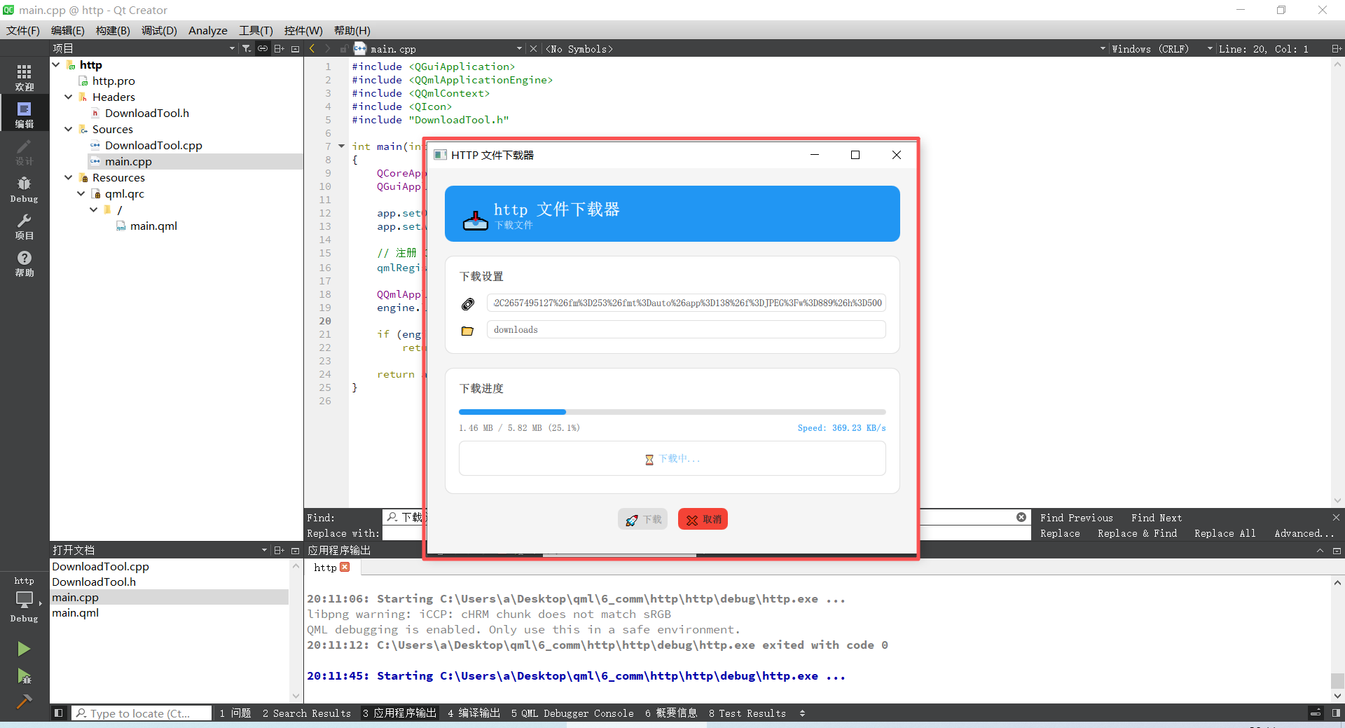 {QCoreApplication::setAttribute(Qt::AA_EnableHighDpiScaling);QGuiApplication app(argc, argv);app.setOrganizationName("YourCompany");app.setApplicationName("FileDownloader");// 注册 C++ 类型到 QMLqmlRegisterType<DownloadTool>("DownloadTool", 1, 0, "DownloadTool");QQmlApplicationEngine engine;engine.load(QUrl(QStringLiteral("qrc:/main.qml")));if (engine.rootObjects().isEmpty())return -1;return app.exec();