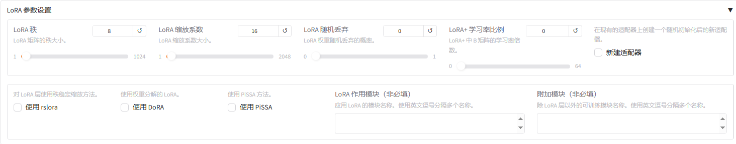 新建适配器 | - | 在现有的适配器上创建一个随机初始化后的新适配器。 | 用于高级工作流,例如连续学习不同任务。初学者通常无需勾选。 |