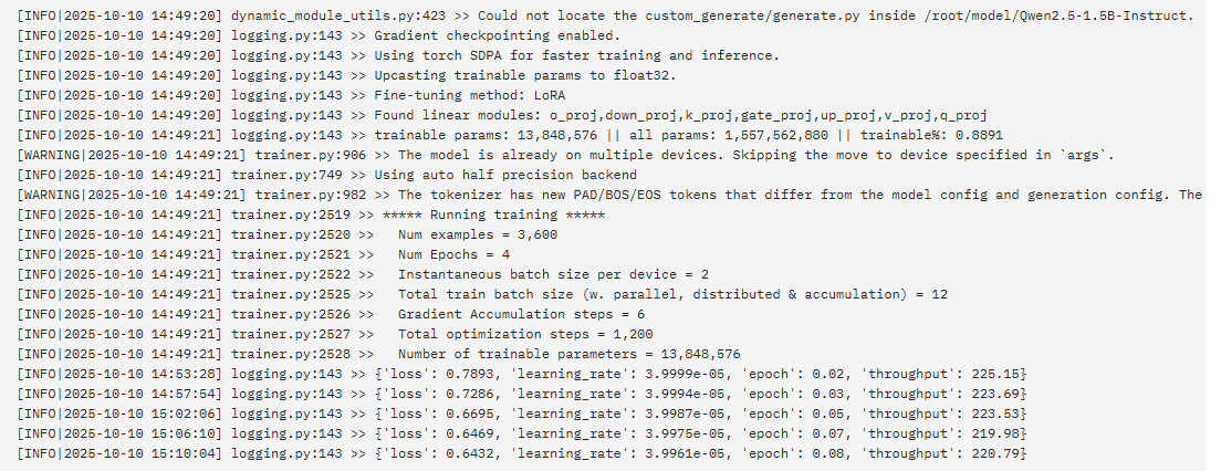llamafactory-cli train \ --stage sft \ --do_train True \ --model_name_or_path /root/model/Qwen2.5-1.5B-Instruct \ --preprocessing_num_workers 16 \ --finetuning_type lora \ --template qwen \ --flash_attn auto \ --dataset_dir data \ --dataset CriminalLaw_train \ --cutoff_len 2048 \ --learning_rate 4e-05 \ --num_train_epochs 4.0 \ --max_samples 4000 \ --per_device_train_batch_size 2 \ --gradient_accumulation_steps 6 \ --lr_scheduler_type cosine \ --max_grad_norm 1.0 \ --logging_steps 5 \ --save_steps 100 \ --warmup_steps 0 \ --packing False \ --enable_thinking False \ --report_to none \ --output_dir saves/Qwen2.5-1.5B-Instruct/lora/train_2025-10-10-09-35-38 \ --bf16 True \ --plot_loss True \ --trust_remote_code True \ --ddp_timeout 180000000 \ --include_num_input_tokens_seen True \ --optim adamw_torch \ --lora_rank 12 \ --lora_alpha 24 \ --lora_dropout 0 \ --lora_target all \ --val_size 0.1 \ --eval_strategy steps \ --eval_steps 100 \ --per_device_eval_batch_size 2
