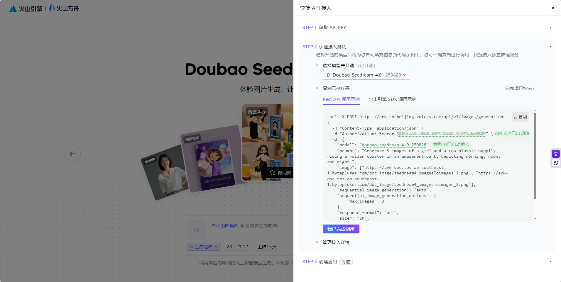 | 设置页面 | 配置表单 | 输入框,保存按钮,状态提示,分组设置项 |### 4.3 响应式设计应用采用移动优先的响应式设计,完美适配手机、平板和桌面设备。在移动端优化触摸交互体验,确保按钮大小适合手指操作。4.4 API调用示例doubao-seedream-4-0-250828调用示例如下curl -X POST <https://ark.cn-beijing.volces.com/api/v3/images/generations> \\-H "Content-Type: application/json" \\-H "Authorization: Bearer your api key" \\-d '{"model": "doubao-seedream-4-0-250828","prompt": "Generate 3 images of a girl and a cow plushie happily riding a roller coaster in an amusement park, depicting morning, noon, and night.","image": \[" <https://ark-doc.tos-ap-southeast-1.bytepluses.com/doc_image/seedream4_imagesToimages_1.png> ", " <https://ark-doc.tos-ap-southeast-1.bytepluses.com/doc_image/seedream4_imagesToimages_2.png> "],"sequential\_image\_generation": "auto","sequential\_image\_generation\_options": {"max\_images": 3},"response\_format": "url","size": "2K","stream": true,"watermark": true}'doubao-seed-1-6-vision-250815调用示例curl <https://ark.cn-beijing.volces.com/api/v3/chat/completions> \\-H "Content-Type: application/json" \\-H "Authorization: Bearer your api key" \\-d $'{"model": "doubao-seed-1-6-vision-250815","messages": \[{"content": \[{"image\_url": {"url": " <https://ark-project.tos-cn-beijing.ivolces.com/images/view.jpeg> "},"type": "image\_url"},{"text": "图片主要讲了什么?","type": "text"}],"role": "user"}]}'