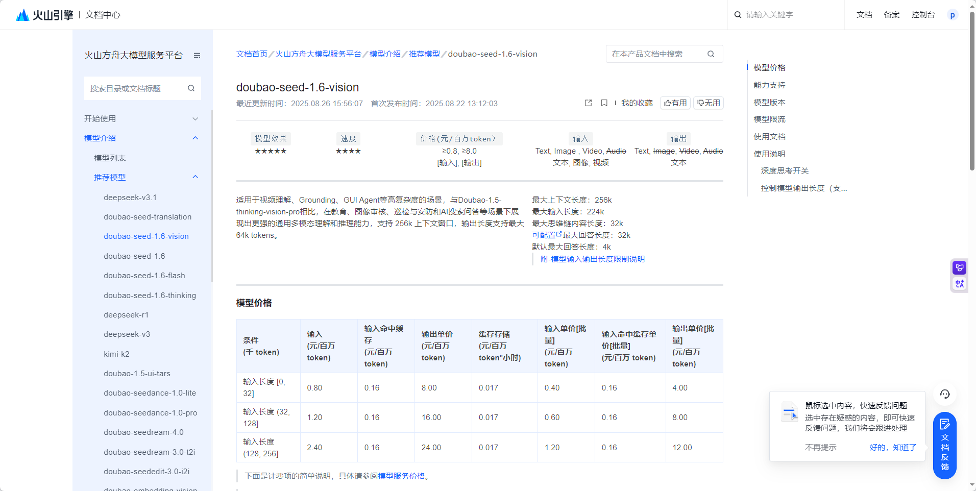 doubao-seed-1-6-vision:适用于视频理解、Grounding、GUI Agent等高复杂度的场景,与Doubao-1.5-thinking-vision-pro相比,在教育、图像审核、巡检与安防和AI搜索问答等场景下展现出更强的通用多模态理解和推理能力,支持 256k 上下文窗口,输出长度支持最大 64k tokens。