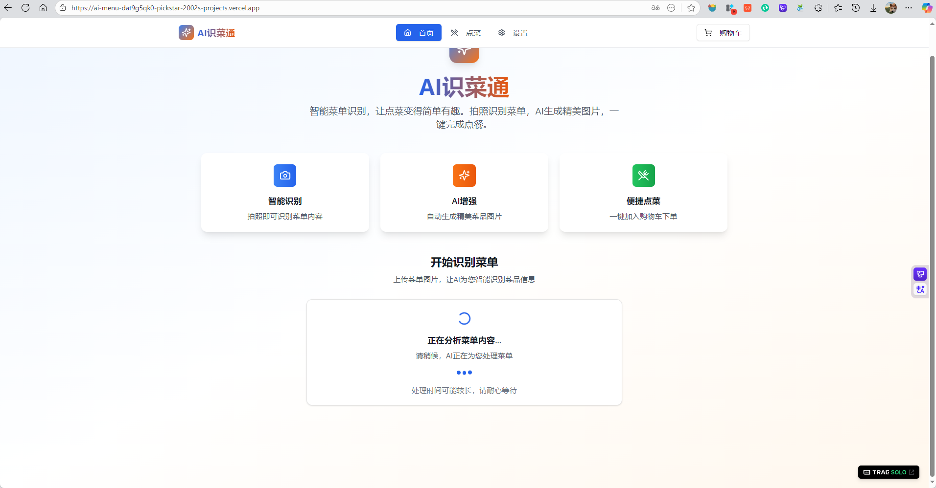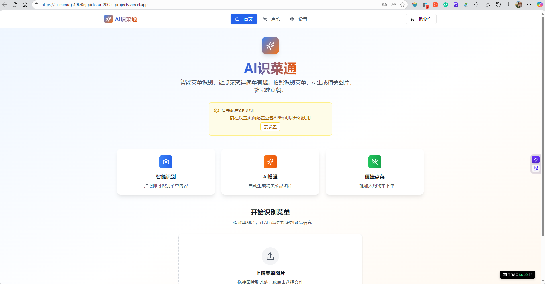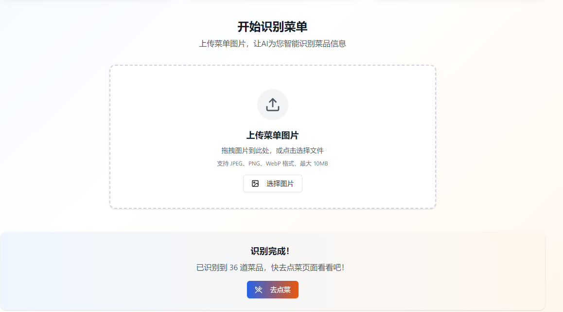 | 首页 | 菜单上传区域 | 支持拖拽或点击上传菜单图片,显示上传进度和预览 |