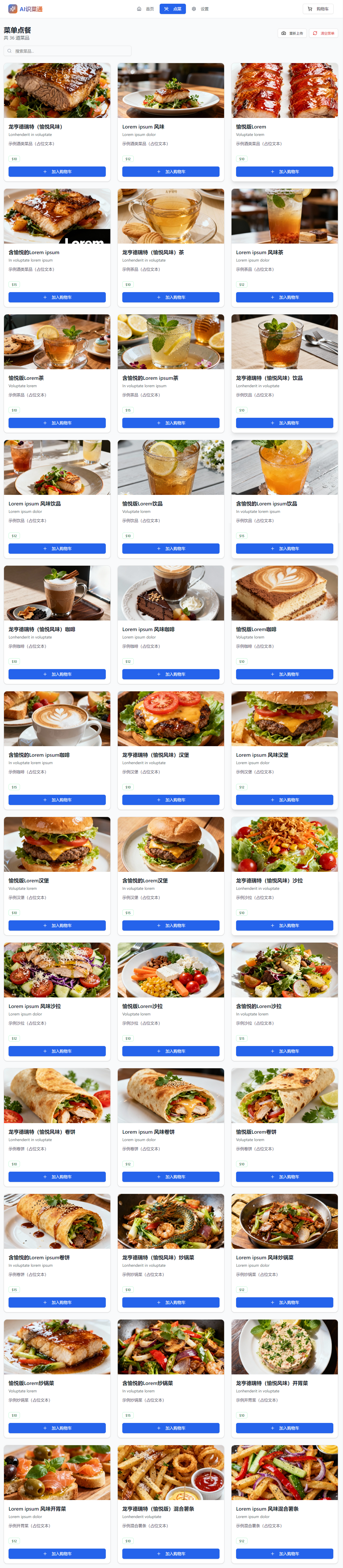 | 点餐页面 | 菜品列表 | 展示AI识别的菜品信息,包含中文名称、原文名称、描述和AI生成图片 |