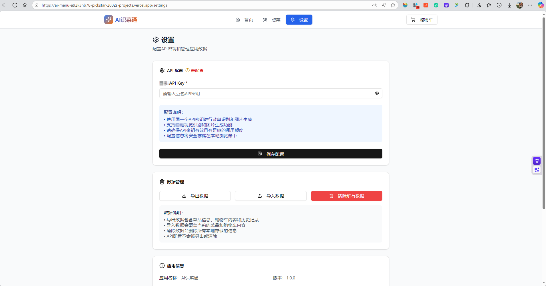 我要做一个AI识菜通应用。功能是:用户可以上传一张任何语言菜单图片,调用视觉理解模型doubao-seed-1-6-vision-250815,分析菜单中的内容并翻译为中文,之后进入第二个页面:点菜页面,点菜页面会将AI翻译后的中文菜单一一展示,并且用户可以点菜。每一道菜都包含它的名字、它的介绍和一张图片,图片调用doubao-seedream-4-0-250828模型的生成图片,然后用户点加号可以把这道菜加入他的购物车,最后点提交生成一个一串字符,上面写他想要点哪些菜,方便他跟服务员说他要点哪些。这个字符应该包合中文名和他元语言的名字。项目需要使用react 实现,使用 shadcn、redix 组件库。AI模型的API KEY放在local storage,通过网页右上角的齿轮按钮输入。