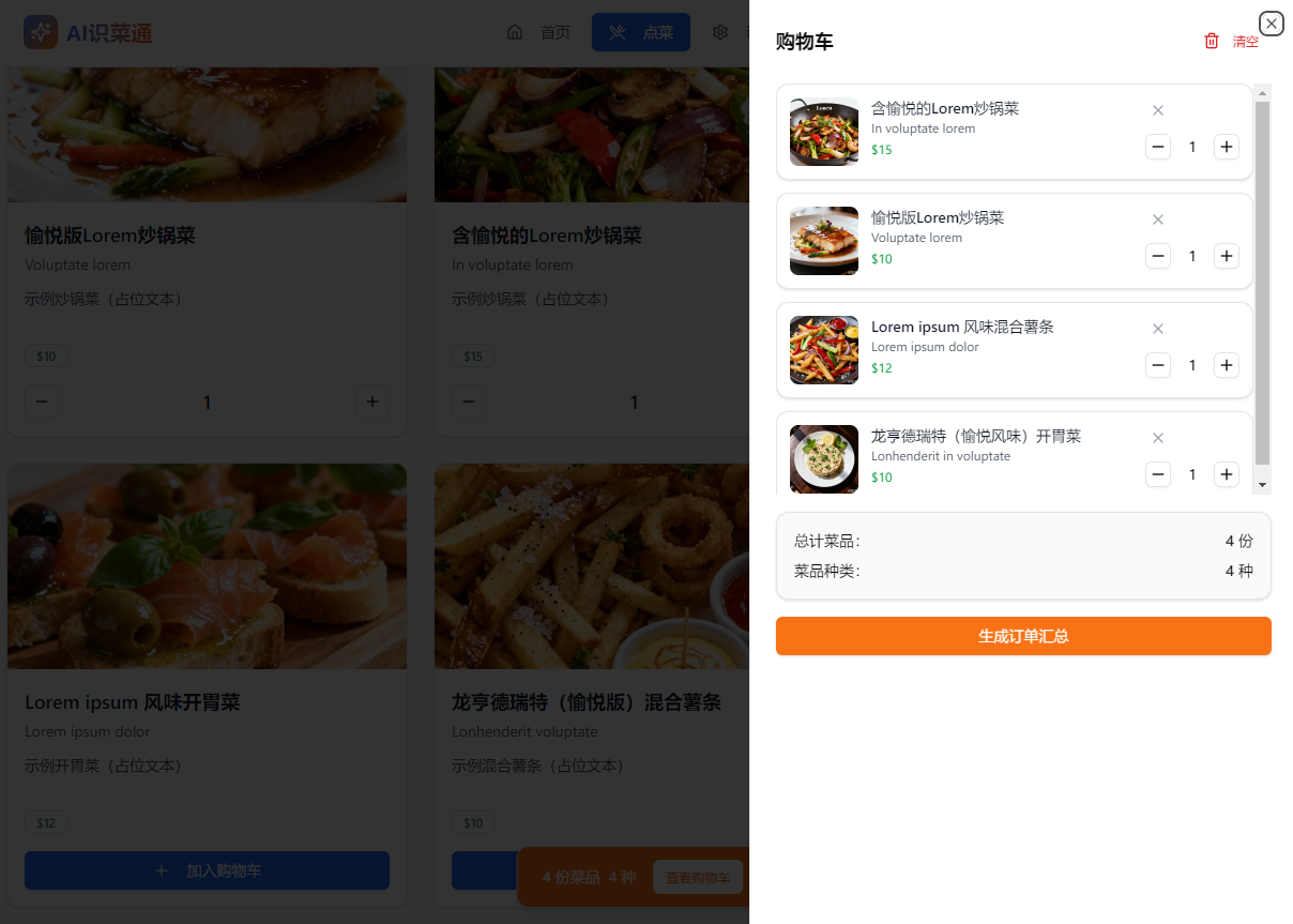 3. 跳转到点餐页面,展示识别结果和AI生成的菜品图片