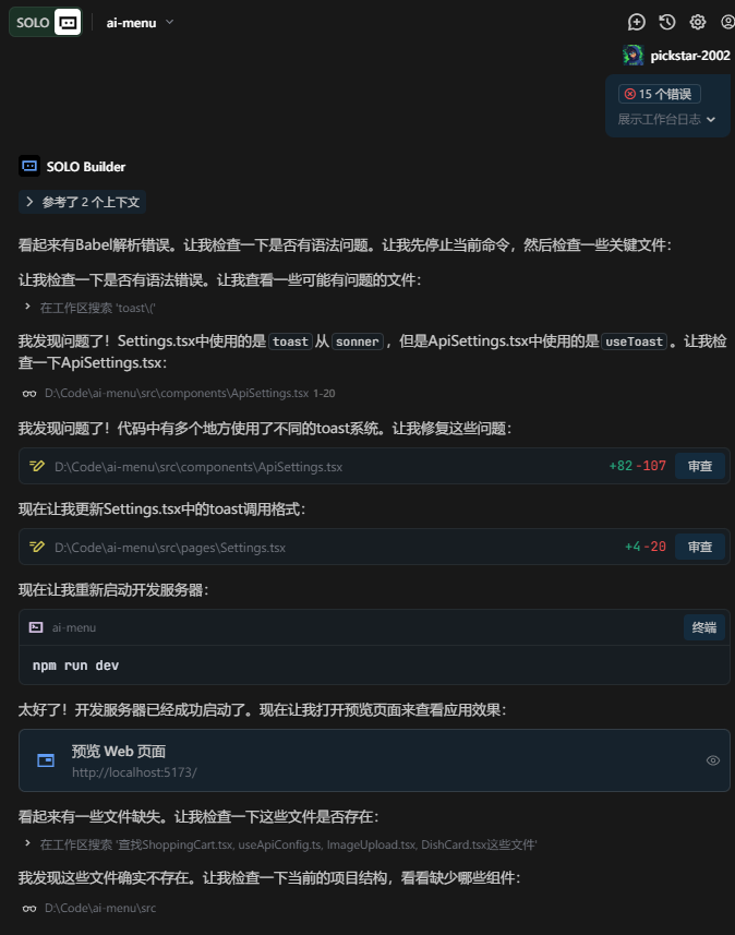 Trae Solo会在开发的过程中自动下载依赖、创建配置文件、生成函数、运行终端,运到的问题也都会被当做上下文继续完善开发,不愧是国产之光,第一位上下文工程IDE,让整个从0到1的过程无比丝滑流畅: