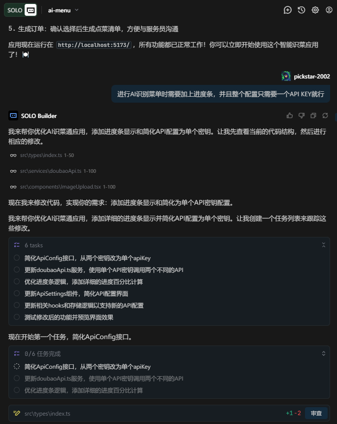 在调用任一AI模型前,Trae Solo 会根据当前任务阶段与系统状态,动态组装最合适的上下文包。例如,在菜单识别阶段,它会将图像、语言先验、菜系知识、任务指令等打包发送给豆包模型;而在生成点餐字符串时,则只传递选中的菜品列表与格式要求。这种按需注入机制,既提升了模型输出的相关性,又避免了信息过载。