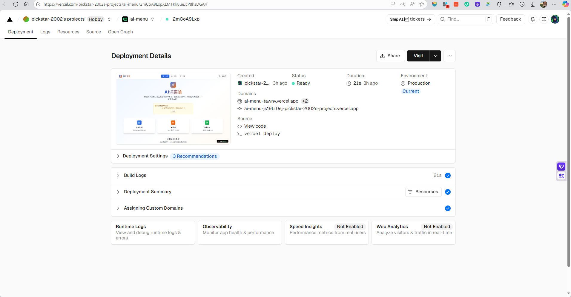 在项目“AI识菜通”的最终部署阶段,我选择了 Vercel 作为前端应用的托管平台。Vercel 以其卓越的开发者体验和对现代前端框架的深度支持,极大简化了部署流程。本项目基于 React 构建,并使用了 shadcn/ui 和 Radix UI 组件库,Vercel 能自动识别项目结构,实现一键部署和持续集成。每次代码推送至 GitHub 仓库,Vercel 都会自动构建并生成预览链接,方便快速测试与迭代。更重要的是,Vercel 提供全球边缘网络分发,确保用户无论身处何地,都能快速加载应用页面。整个“AI识菜通”从前端交互、图片上传,到调用腾讯混元大模型进行多语言菜单识别与菜品图像生成,最终生成点餐字符串,全部通过 Vercel 高效、稳定地交付给用户。借助 Vercel 的免费计划和无缝 DevOps 能力,我得以将精力聚焦在核心 AI 功能开发上,而无需担心服务器运维,真正实现了“开发即部署”的现代 Web 开发体验。https://ai-menu-a92k3hb78-pickstar-2002s-projects.vercel.app/