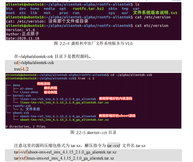 进入到虚拟机里的出厂系统文件系统目录下,解压压缩包后即可执行指令查看文件系统版 本。 cd ~/alpha/alientek-alpha/rootfs-alientek tar vxjf rootfs.tar.bz2 //解压出厂系统压缩包 cat etc/version