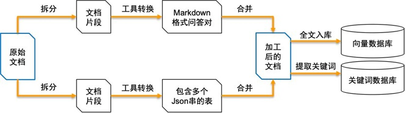 根据经验,将数据按照不同组织形式进行针对性处理,会有效提高知识库问答准确率。数据预处理这一步骤主要的作用是将原始文档按照不同文本形式拆分并转换后,再合并成新的处理后的文档,之后将其内容注入向量数据库,并提取关键词注入关键词数据库,如下图所示: