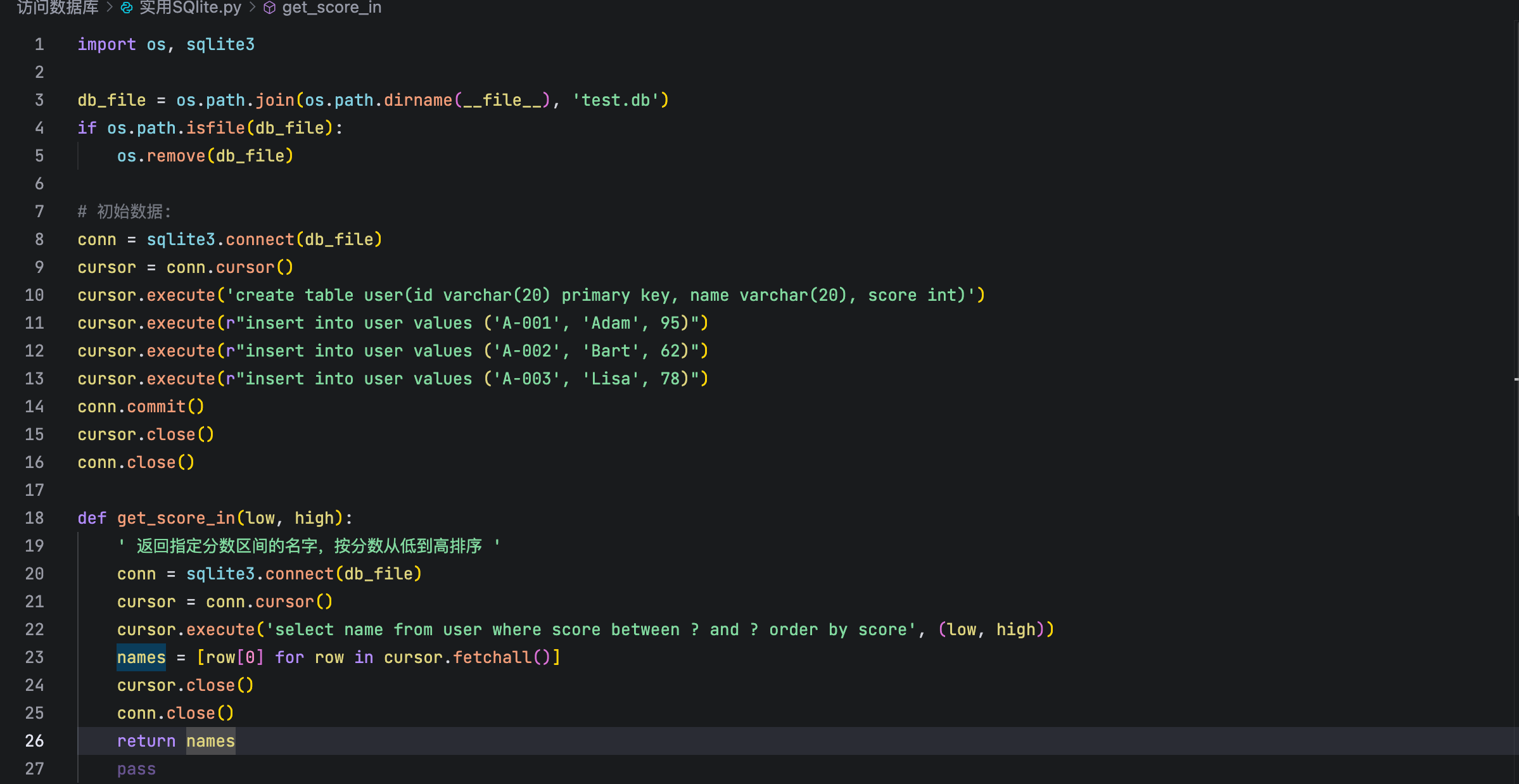 conn.close()def get_score_in(low, high):' 返回指定分数区间的名字,按分数从低到高排序 'pass# 测试: