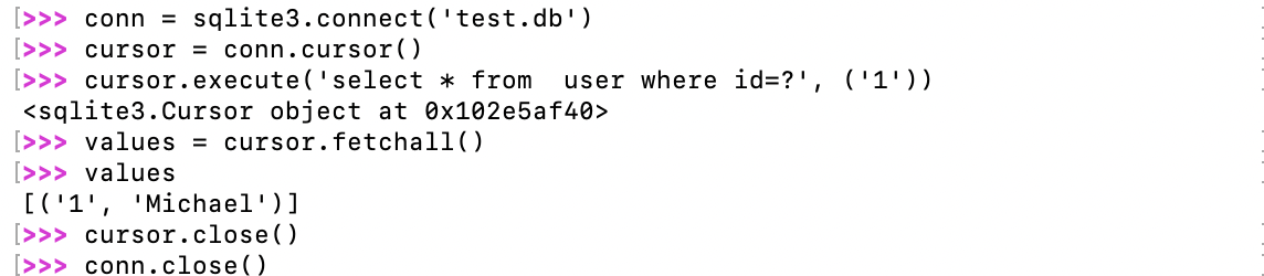 cursor.execute(r"insert into user values ('A-002', 'Bart', 62)")