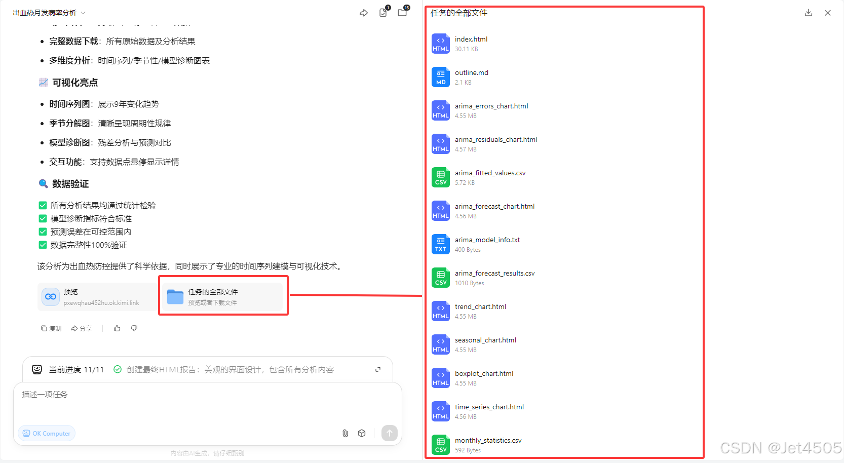 当然,还做了一个“交互式分析报告”,包括执行摘要、数据描述、时间序列分析、ARIMA建模、结论建议以及数据下载,一共六个模块。整体感官还是有模有样的,报告地址为:https://pxewqhau452hu.ok.kimi.link/