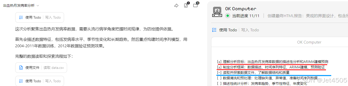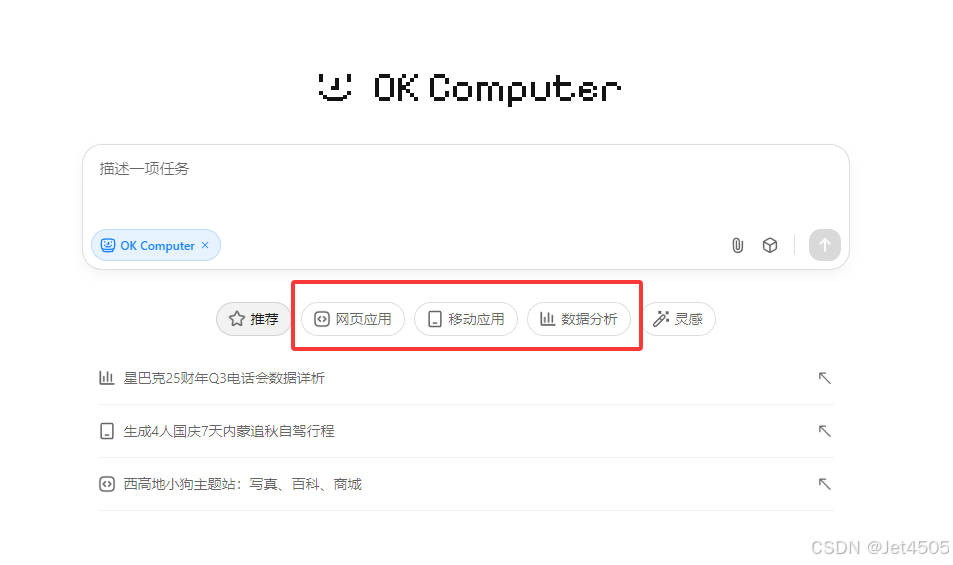只需点亮“OK Computer”按钮,即可激活相关功能。官方提供的应用场景包括“网页应用”“移动应用”“数据分析”以及“灵感激发”等。此前我已测试过Claude 3.7 Sonnet进行数据分析(ARIMA建模),整体表现只能说勉强及格。