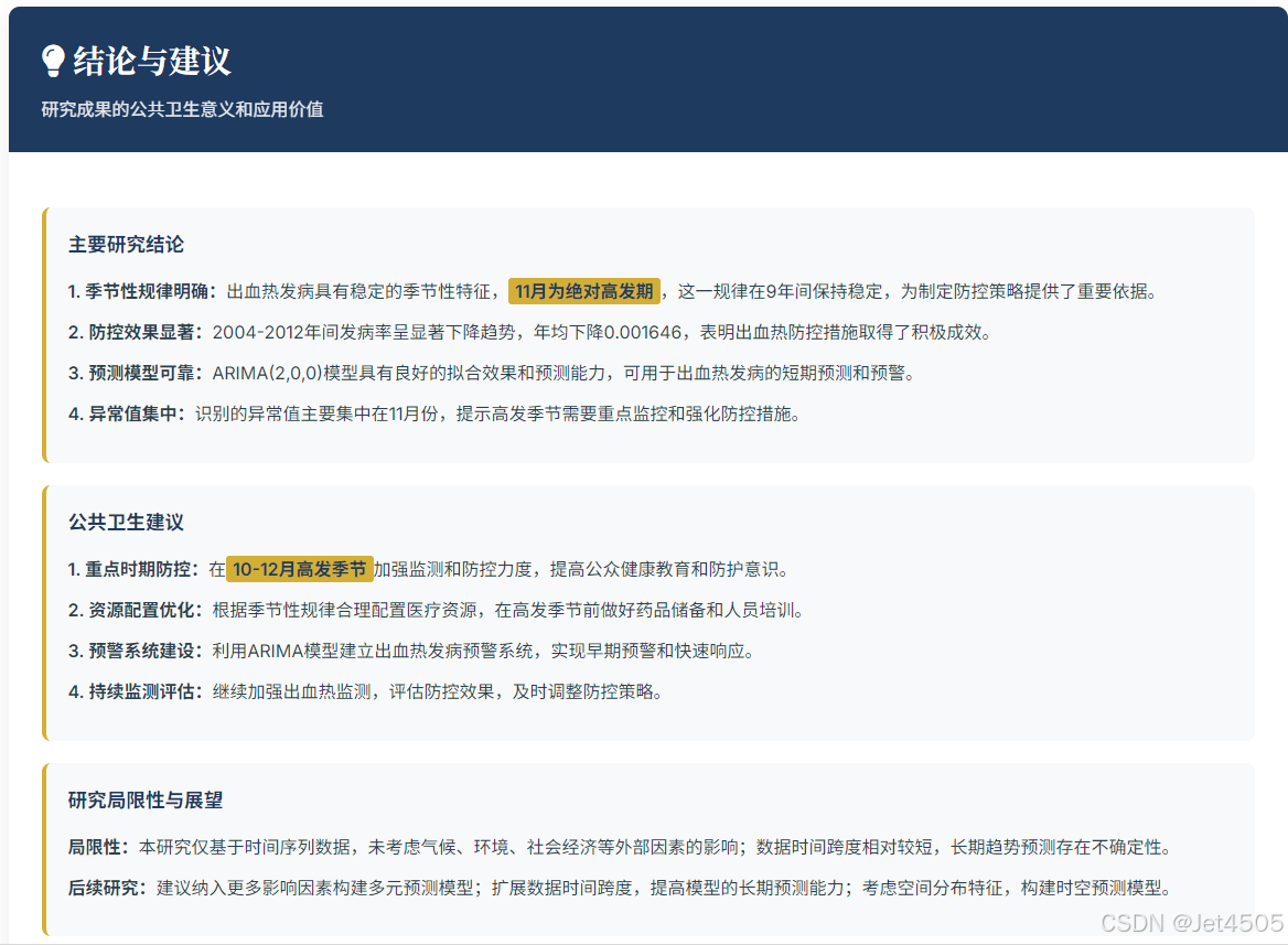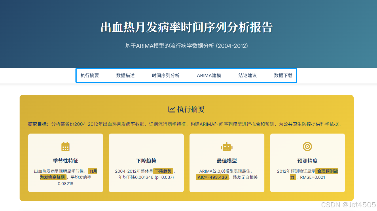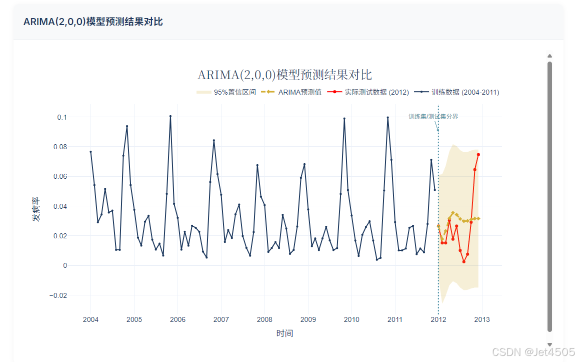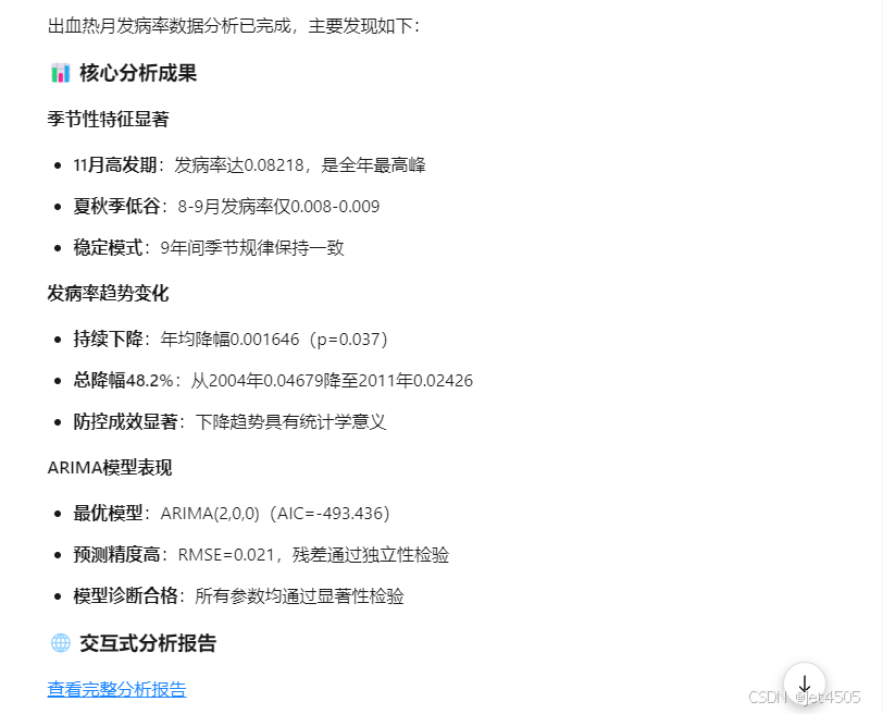 提示词:附件“data”是某省份2004年至2012年出血热的月发病率数据,请进行如下数据分析:(1)常规的数据描述性分析,但是要结合专业背景;(2)构建ARIMA模型进行拟合和预测,其中2004-2011年作为训练集,2012年作为验证集。输出报告可交互的最终报告,界面风格要美观。