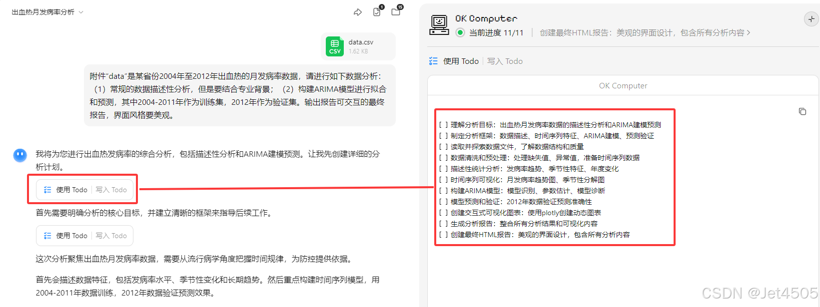 (2)但在专业数据分析方面,短板仍较为明显。对于一般的描述性分析,如季节性分析、趋势分析等,表现基本良好,但在更为专业的ARIMA建模中则稍显不足。例如,面对存在季节性的数据时,未能自动考虑SARIMA模型(当然这也可能与提示词设置有关);参数设置和选择相对简单;最终结果输出也未展示训练集和验证集的性能参数等。