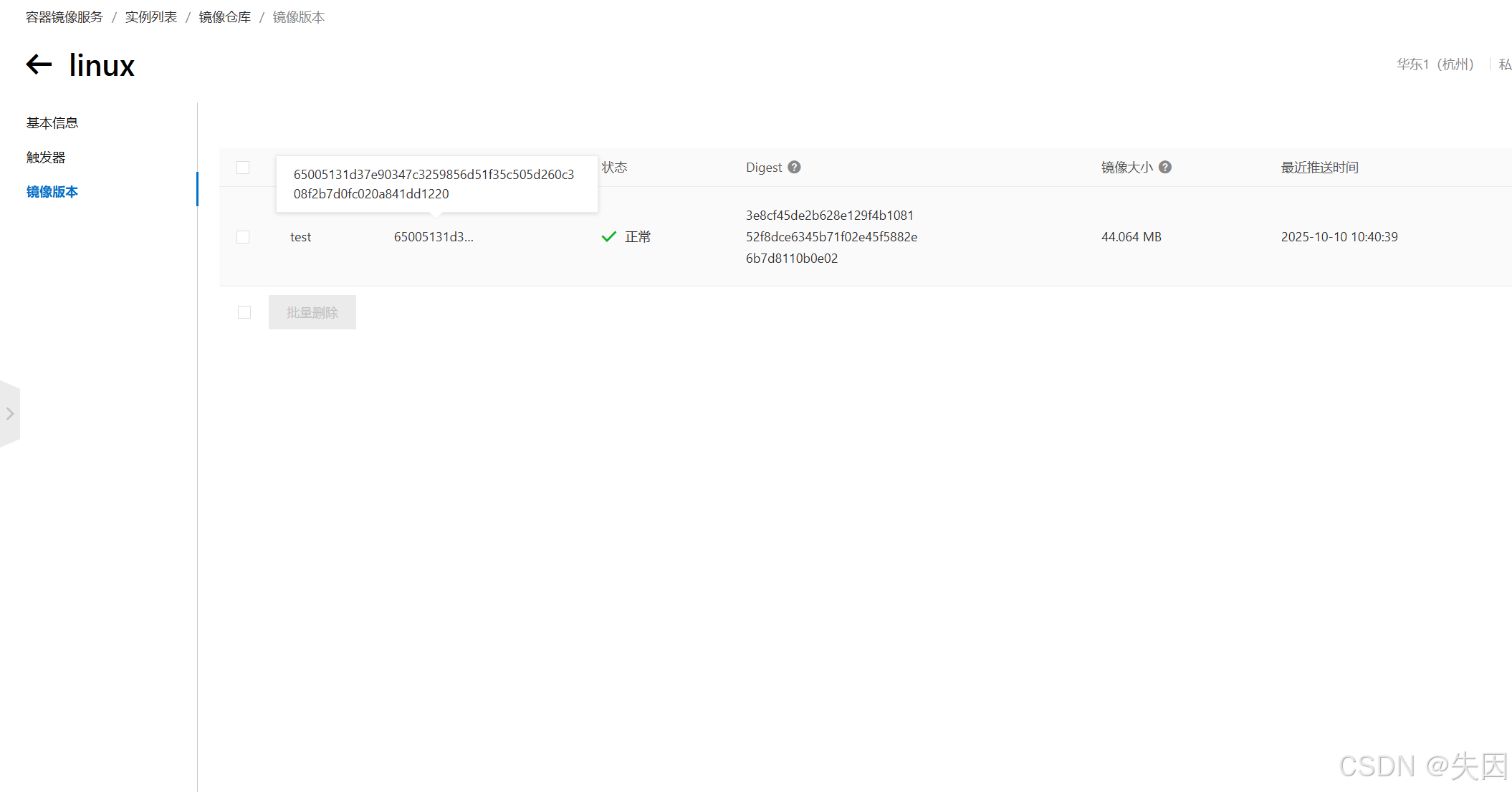 - 上传完成后,回到阿里云控制台「镜像仓库→版本管理」,可看到 test 版本的镜像。