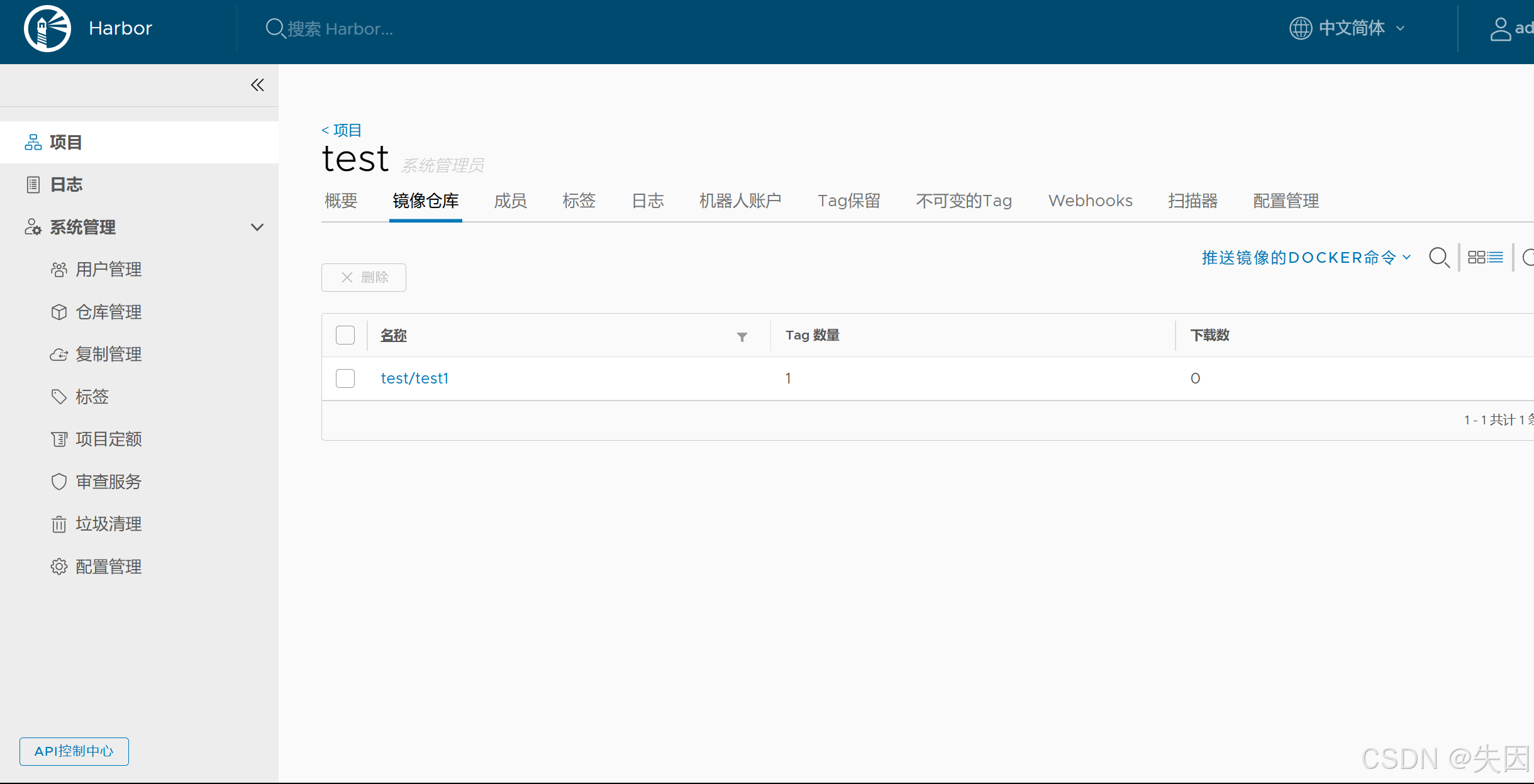 - 登录 Harbor 图形化界面→进入 test 项目→点击「镜像仓库」,可看到 test1 镜像及 v1 版本。