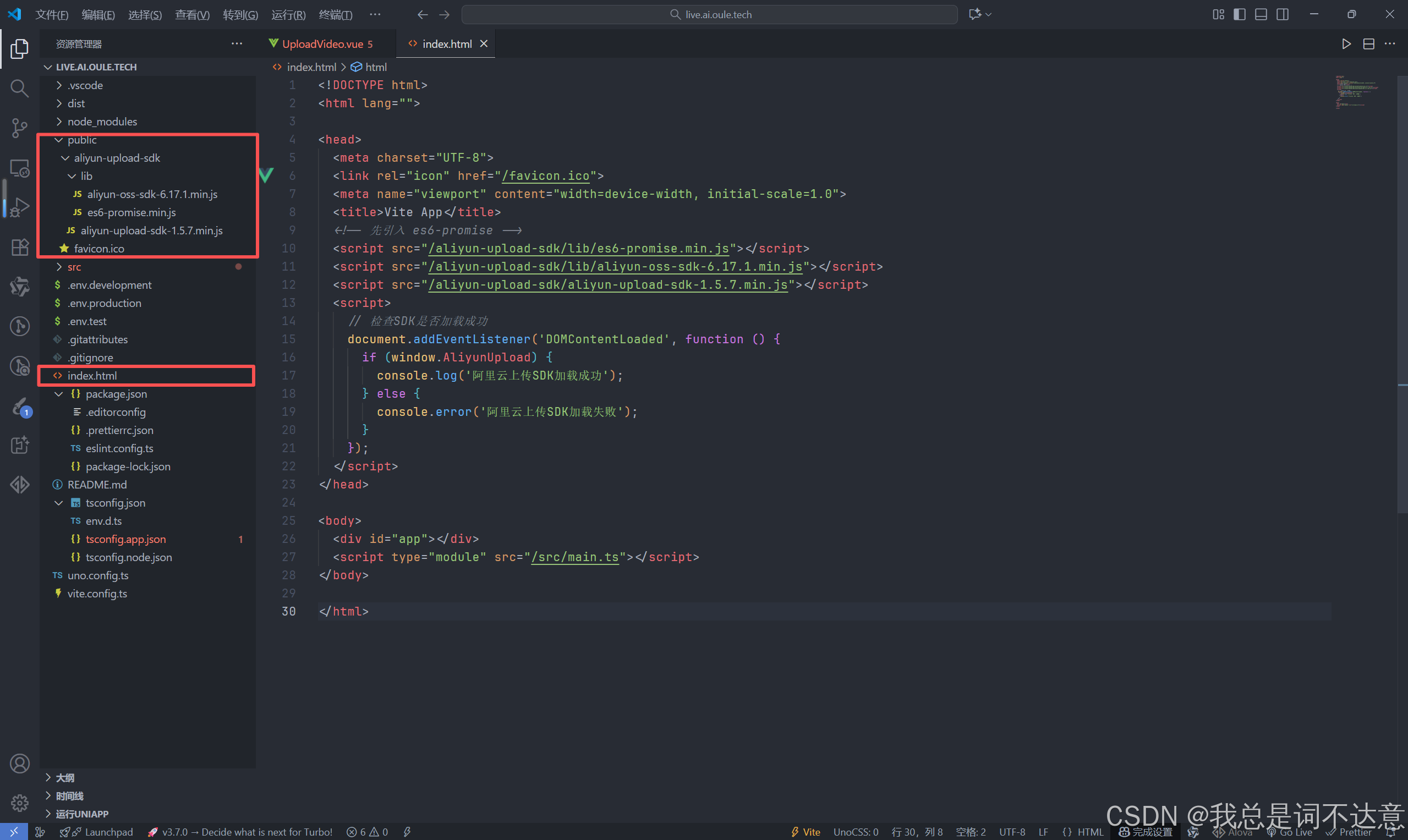 首先下载并引用阿里云的sdk,建议放在 public 文件夹中,在入口文件 index.html 导入