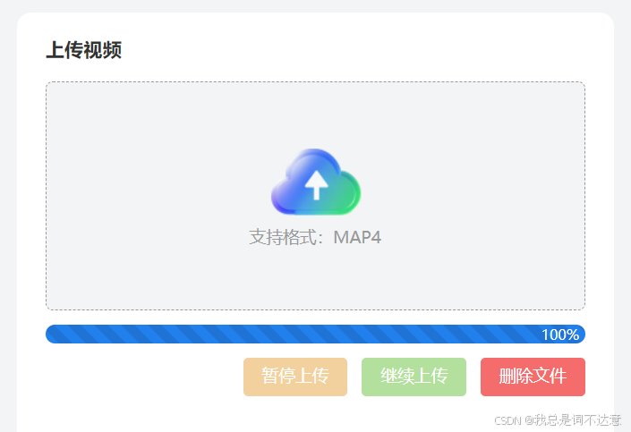 const authUpload = () => {if (uploader.value && fileData.value) {uploader.value.startUpload()startDisabled.value = true // 禁用开始按钮pauseDisabled.value = false // 启用暂停按钮resumeDisabled.value = true // 禁用继续按钮uploadDisabled.value = true // 上传时不能再次点击上传}