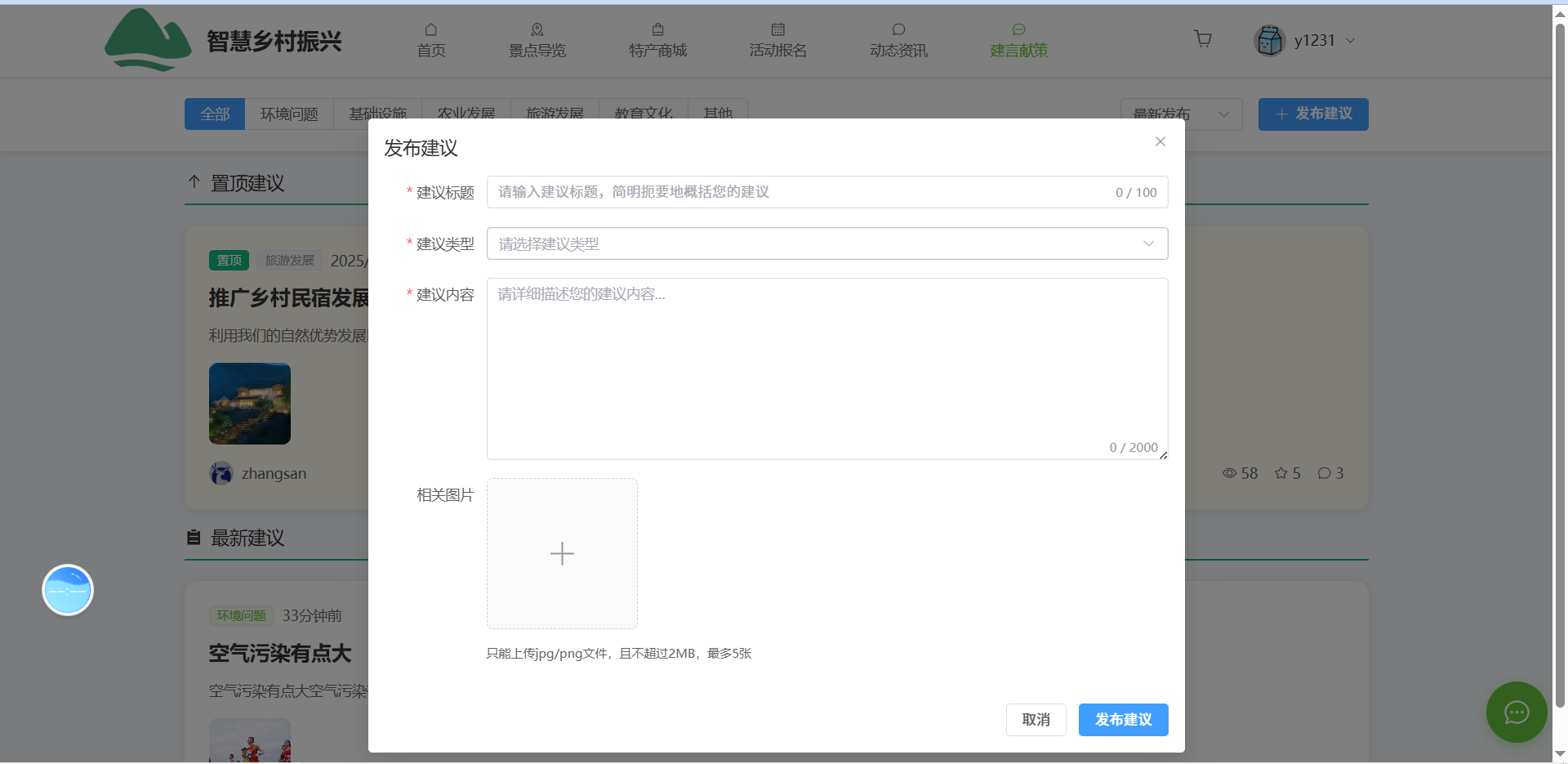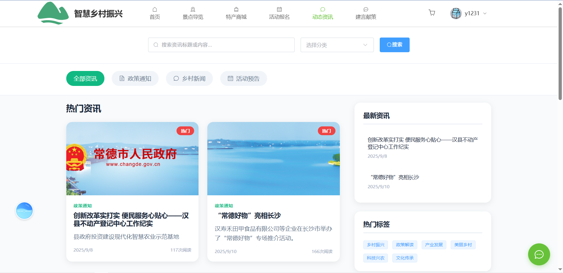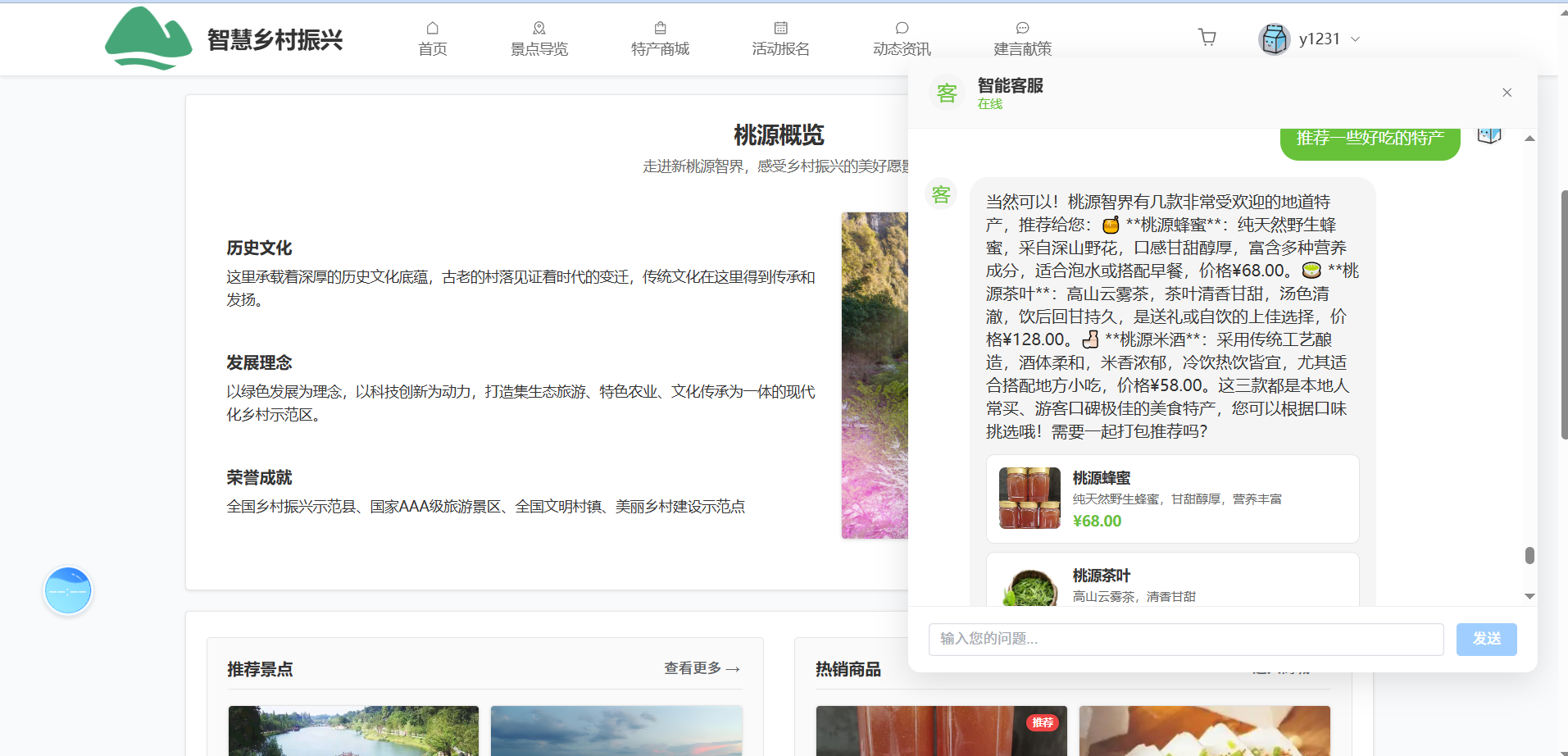 基于Spring Boot + Vue 3的乡村振兴综合服务平台。系统聚焦于推动乡村旅游、特色农产品销售、文化活动推广等方面,旨在通过信息化手段助力乡村经济发展。平台集成了景点导览、特产商城、活动报名、资讯发布、建言献策等多项功能,并创新性地引入AI智能客服,为用户提供便捷的咨询服务。
