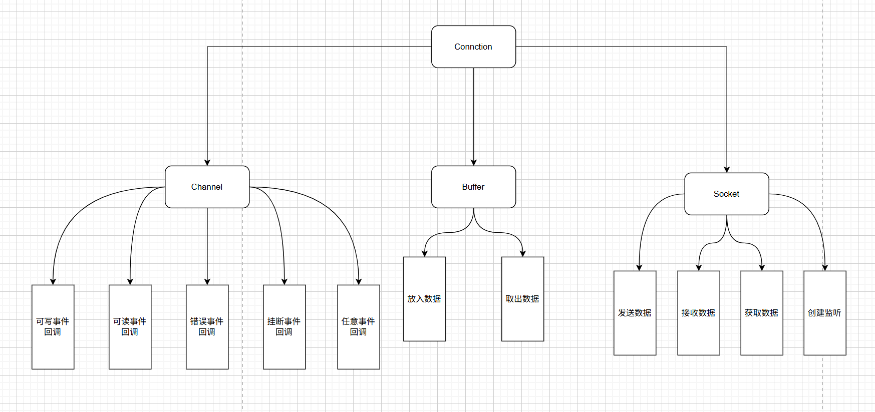 • Connection模块内部包含有三个由组件使用者传入的回调函数:连接建⽴完成回调,事件回调, 新数据回调,关闭回调。