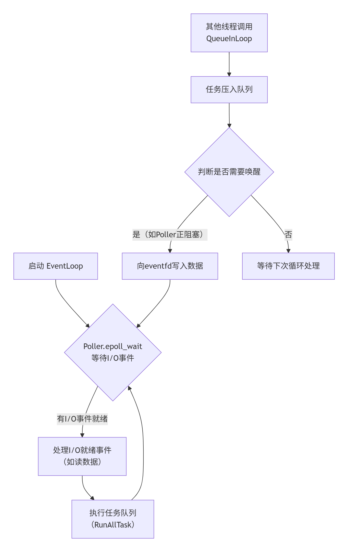 此外EventLoop采用 Poller+任务队列 的模式进行I/O事件的处理和任务的处理,为了防止Poller因为没有任务到来而阻塞,所以通过eventFd,来进行对Poller的唤醒以此来 执行任务队列。