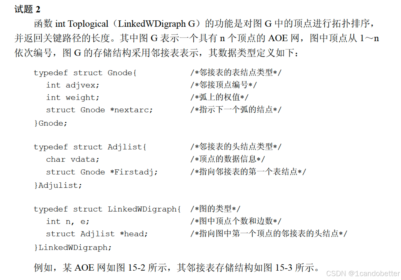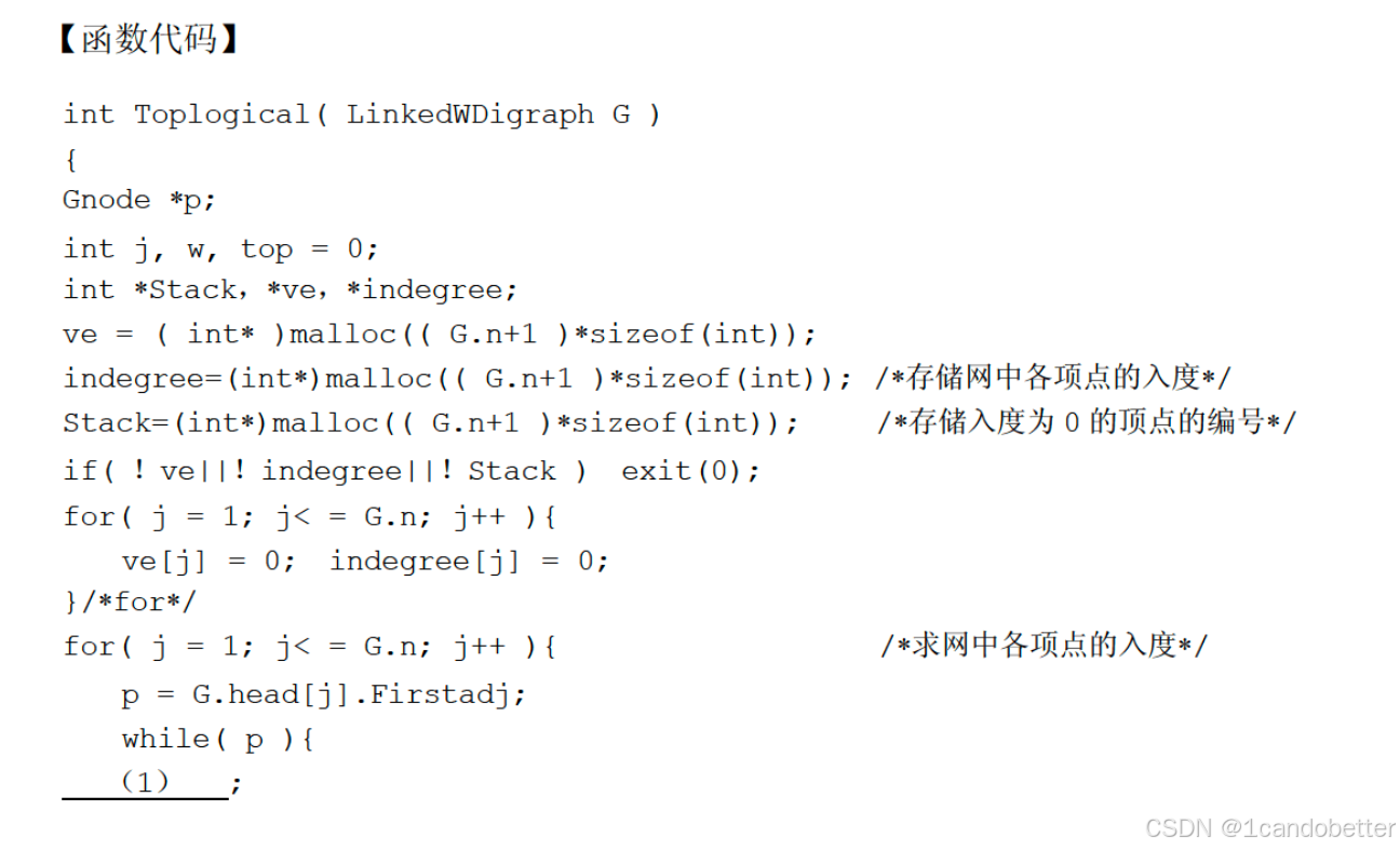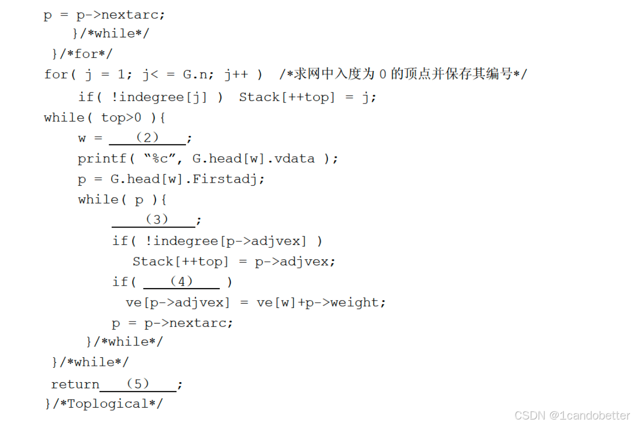 while(p) { // 遍历所有邻接点___(3)__; // 减少邻接点的入度if(!indegree[p->adjvex]) // 如果邻接点入度变为0Stack[++top] = p->adjvex; // 将该邻接点入栈if( ___(4)__ ) // 关键路径判断ve[p->adjvex] = ve[w] + p->weight; // 更新最早开始时间p = p->nextarc; // 处理下一条边}