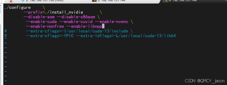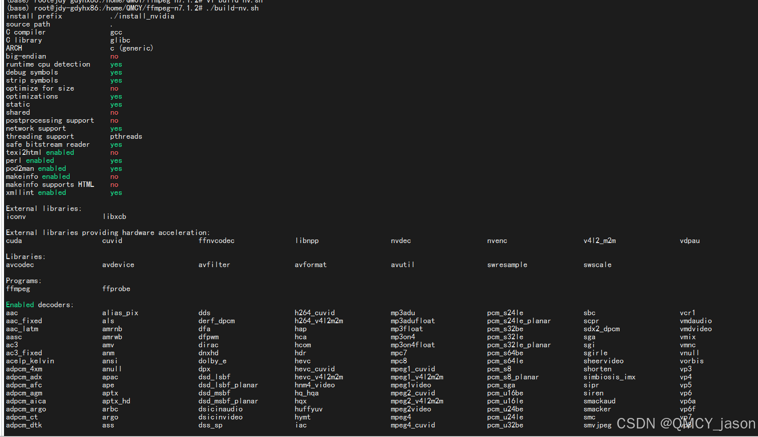 ./configure \--prefix=./install_nvidia \--disable-asm --disable-x86asm \--enable-cuda --enable-cuvid --enable-nvenc \--enable-nonfree --enable-libnpp \--extra-cflags=-I/usr/local/cuda/include \--extra-cflags=-fPIC --extra-ldflags=-L/usr/local/cuda/lib64