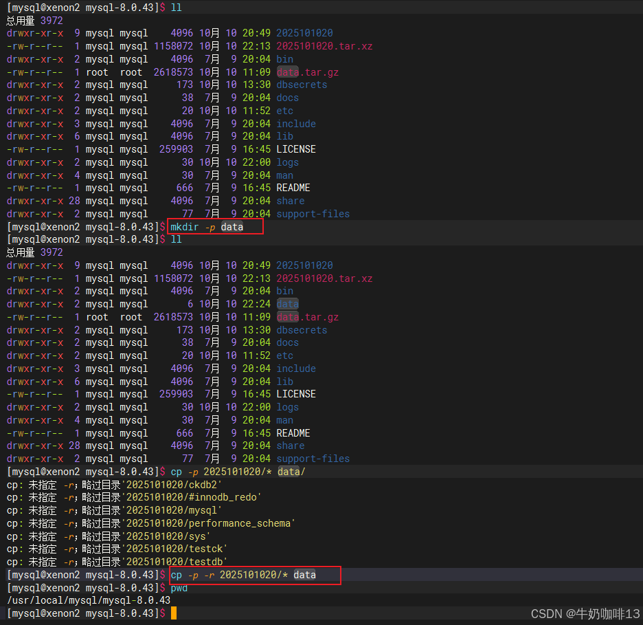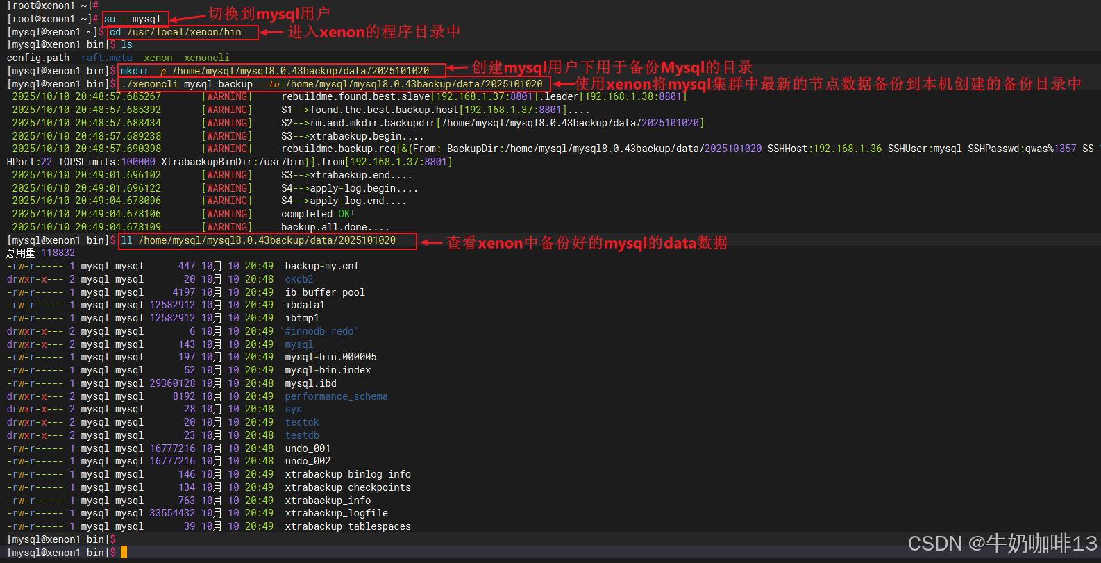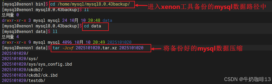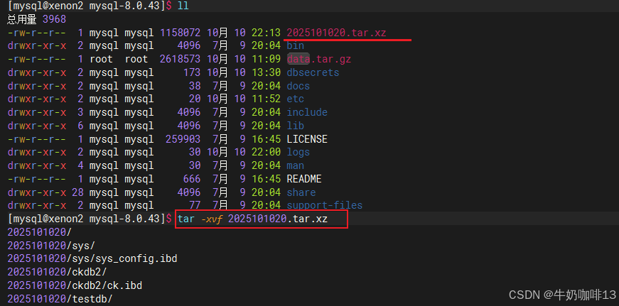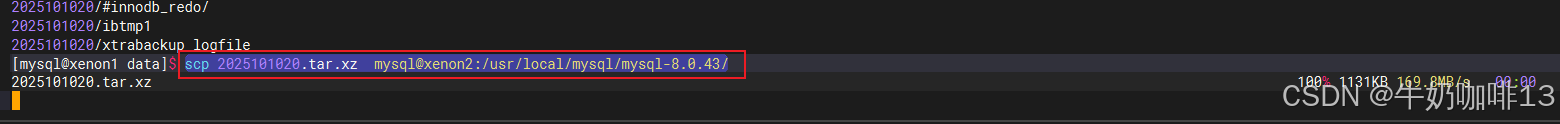 scp 2025101020.tar.xz mysql@xenon2:/usr/local/mysql/mysql-8.0.43/#2.2-进入到该故障节点的【/usr/local/mysql/mysql-8.0.43】目录中,将xenon备份的Mysql数据【2025101020.tar.xz】解压到【/usr/local/mysql/mysql-8.0.43/data】目录中
